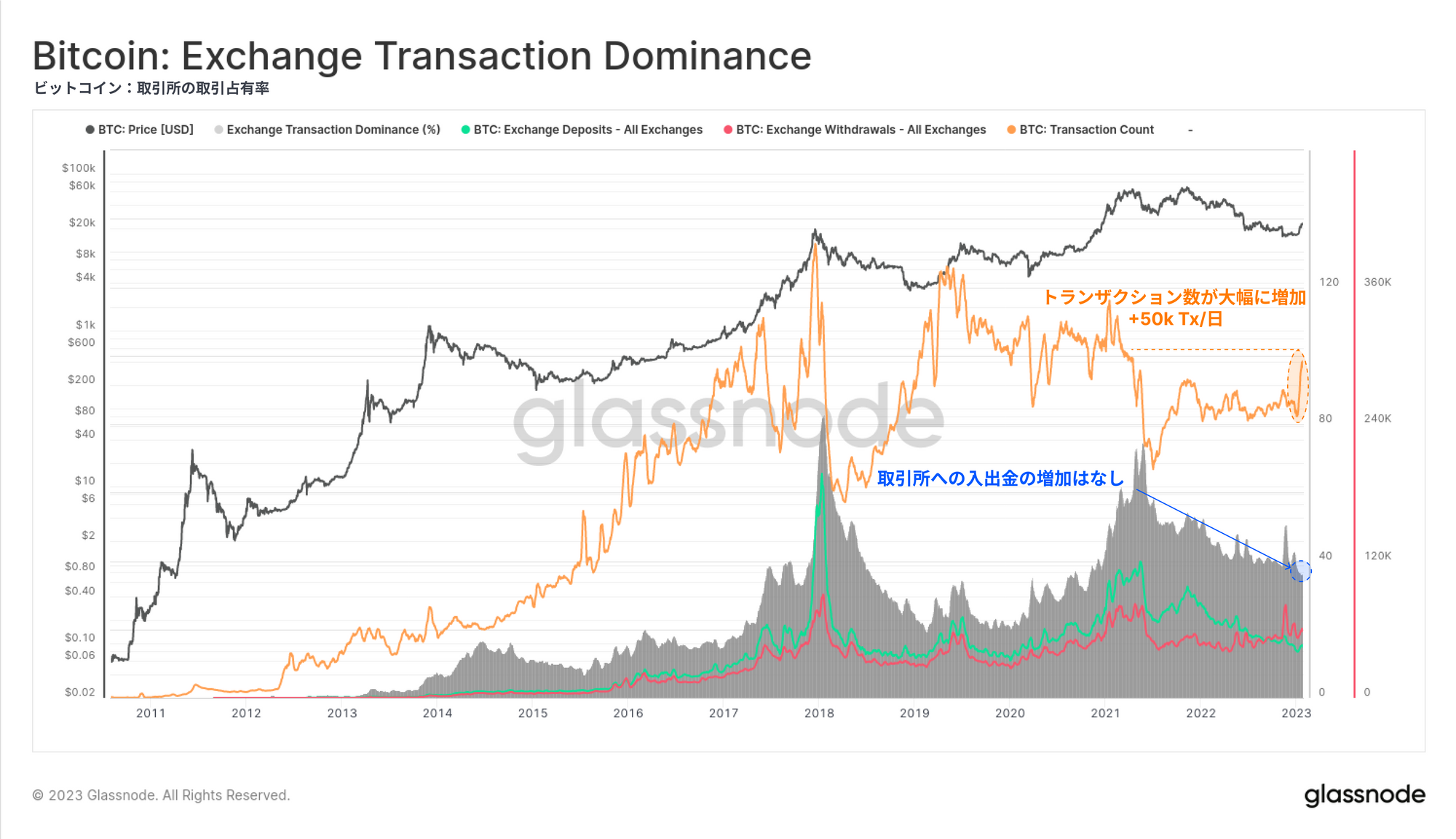 今週、ビットコインのオンチェーン取引は1日あたり5万件以上へと急増したが、取引所への入金や出金の件数がそれに見合うほど増えているわけではない。現在の取引所関連の取引は、総取引数のうちわずか35%であり、この占有率は2021年5月の市場のピーク以降、依然として下降トレンドにある。