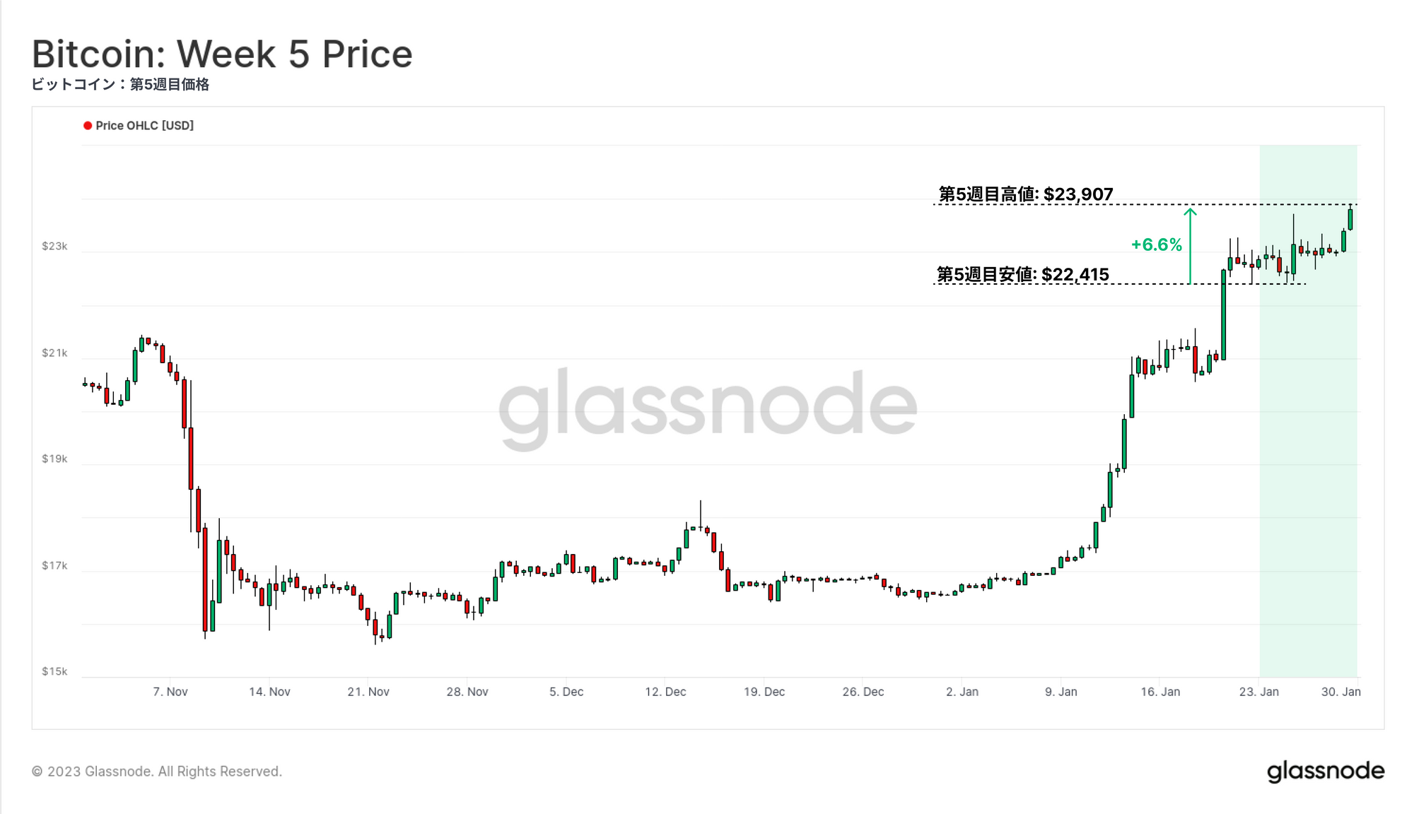 デジタル資産の上昇は今週も続き、ビットコイン価格は日曜日の夕方に23.9kドルの高値に達した。1月のビットコイン市場は、2021年10月以来最高の月間価格パフォーマンスを記録し、年初来で+43%以上となった。ビットコイン価格は2022年8月以来の高水準であり、22.4kドルの週次安値から+6.6%の上昇である。