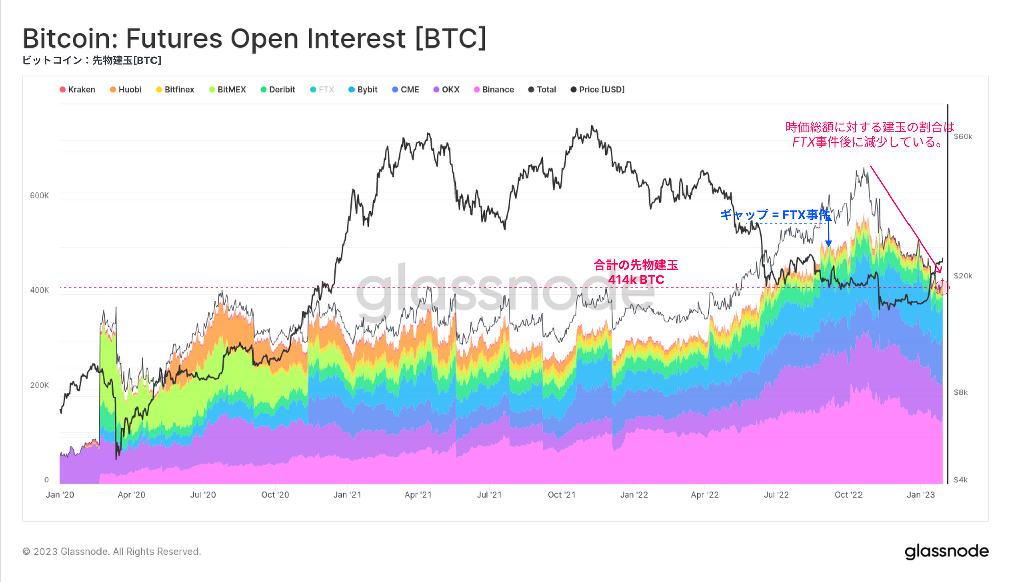 なお、この下落の40%は、FTX取引所で保有されていた95kBTC相当の建玉が失われたことに直接的に起因している。