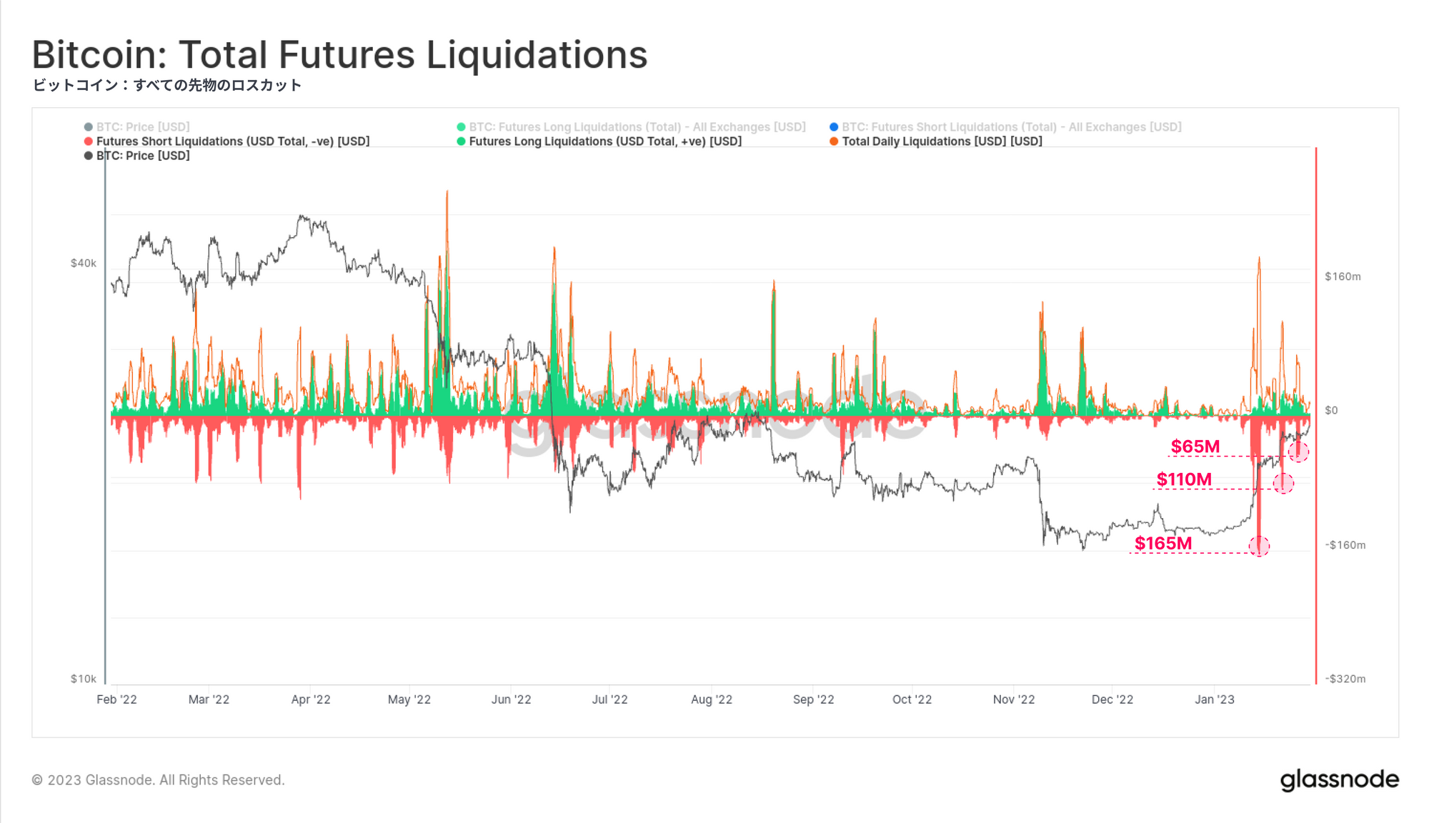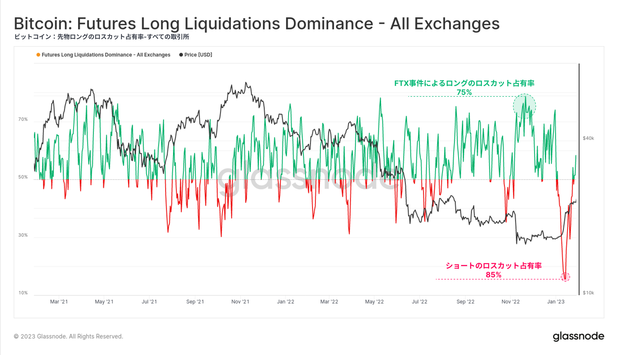 1月中旬の最初のショートスクイーズは多くのトレーダーを驚かせ、ロングの清算比率は15%という史上最低の数字を記録した(清算の85%はショートだったことを意味する)。これは、FTXの暴落時に清算されたロング(ロングの占有率は75%)に比べても大きなもので、多くのトレーダーにとっていかに予想外であったかを示している。