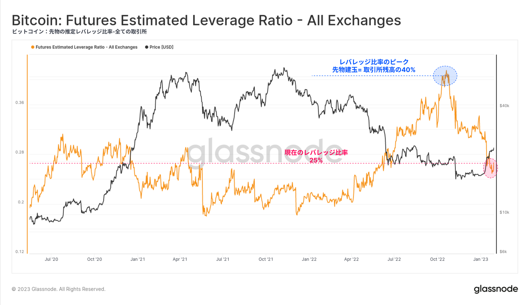 先物取引の建玉の想定元本と対応する取引所のBTC残高を比較すると、市場におけるレバレッジの相対的な規模を測定できる。このレバレッジ比率は、スポット取引所残高の40%に相当する建玉から、過去75日間でわずか25%まで減少していることがわかる。