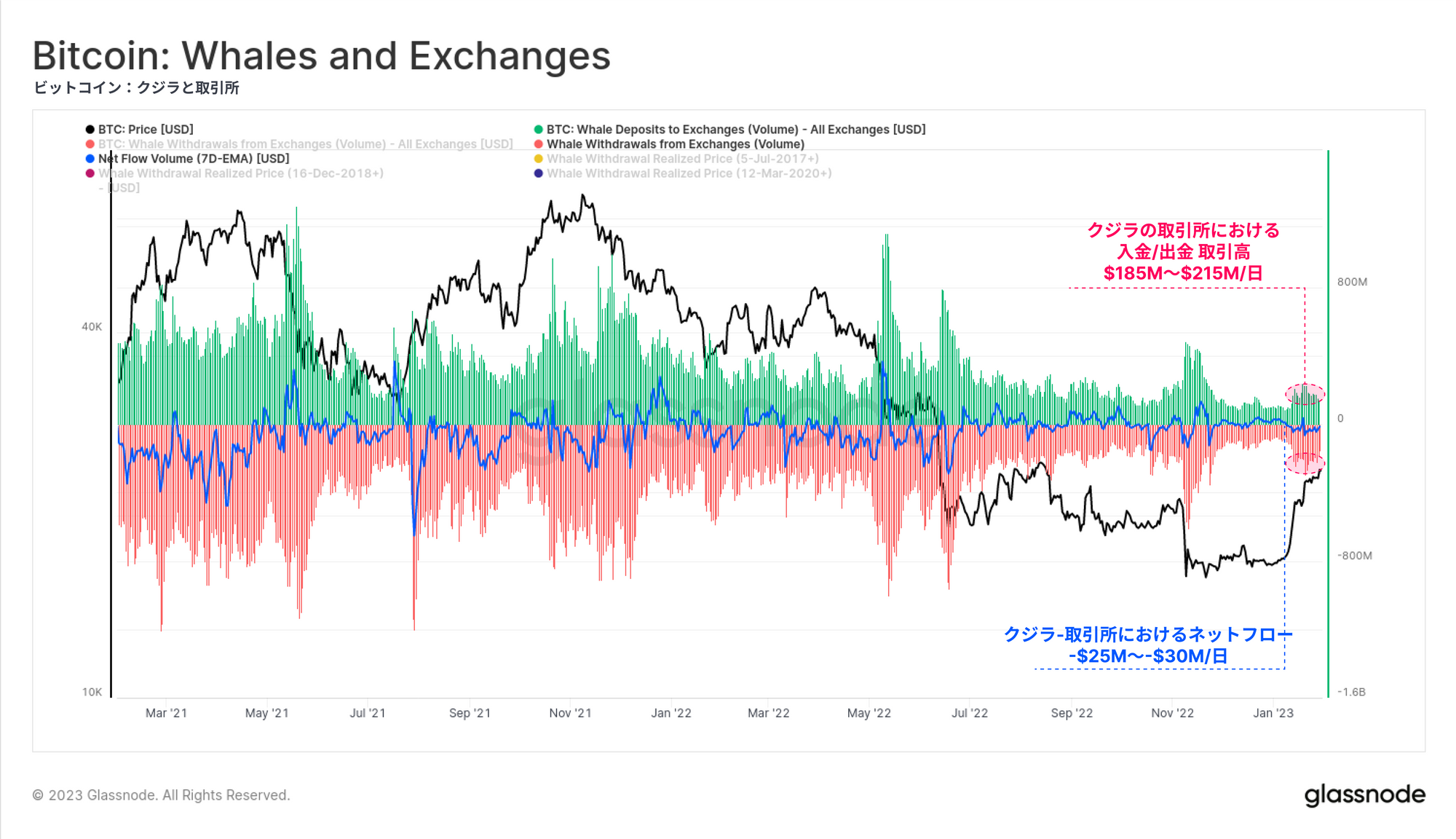 特に1,000BTC以上を保有するクジラエンティティに注目すると、取引所への入金量と出金量の両方が増加していることが確認できる。1月を通して、クジラエンティティの取引所への流入(および流出)総額は1億8500万ドルから2億1500万ドルであり、ネット総額は約2500万ドルの出金であった。