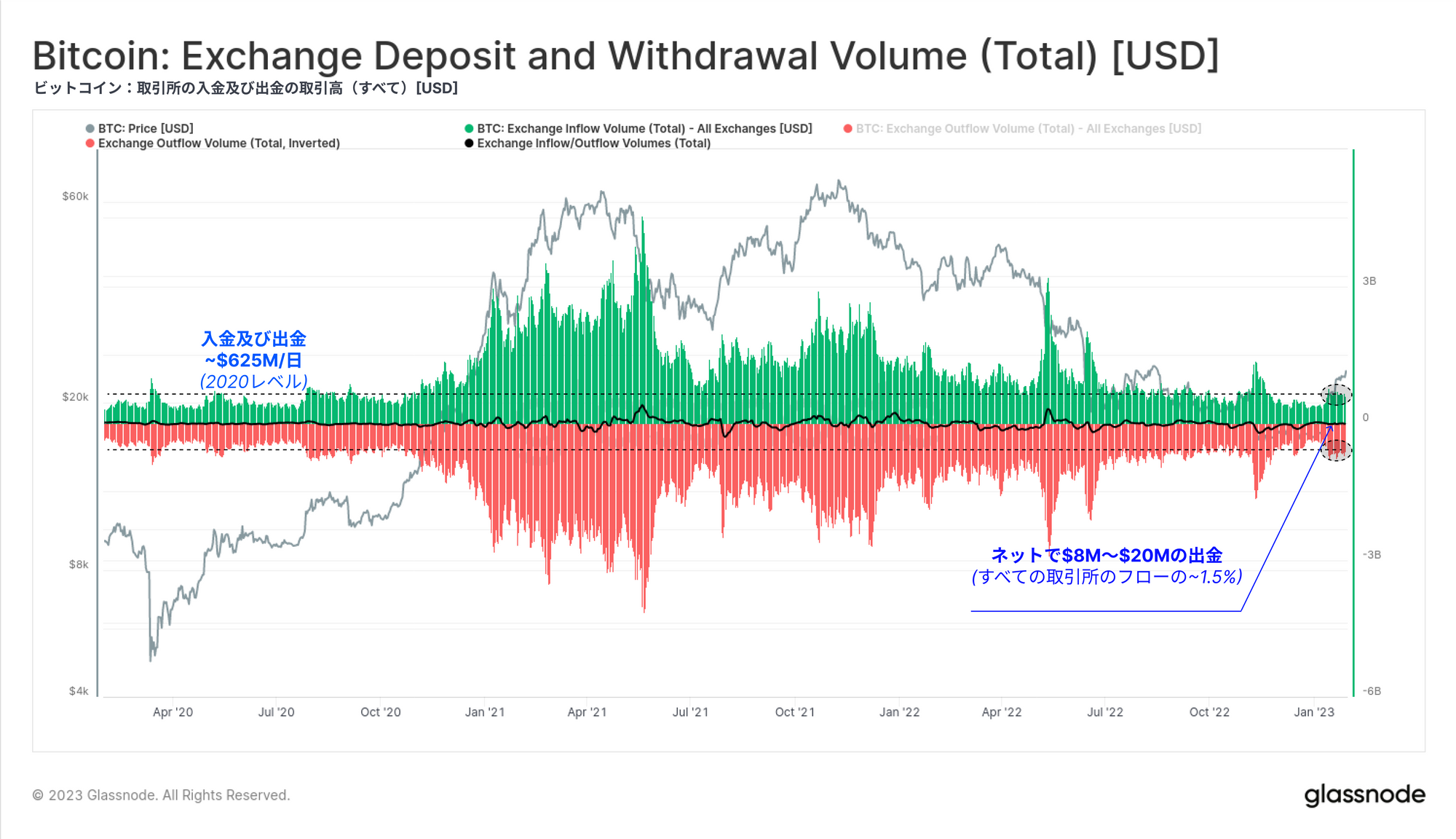 取引所へのコインの流入と流出の総量は、現在双方向において約$625M/日(すなわち合計$1.25B/日)である。1日のネットフローは$20M程度で、これは全体の1.5%に過ぎず、取引所のフローは驚くほど均等なバランスであることを示している。1日当たり2億ドルから3億ドルの純流出があった11-12月期とは対照的といえる。