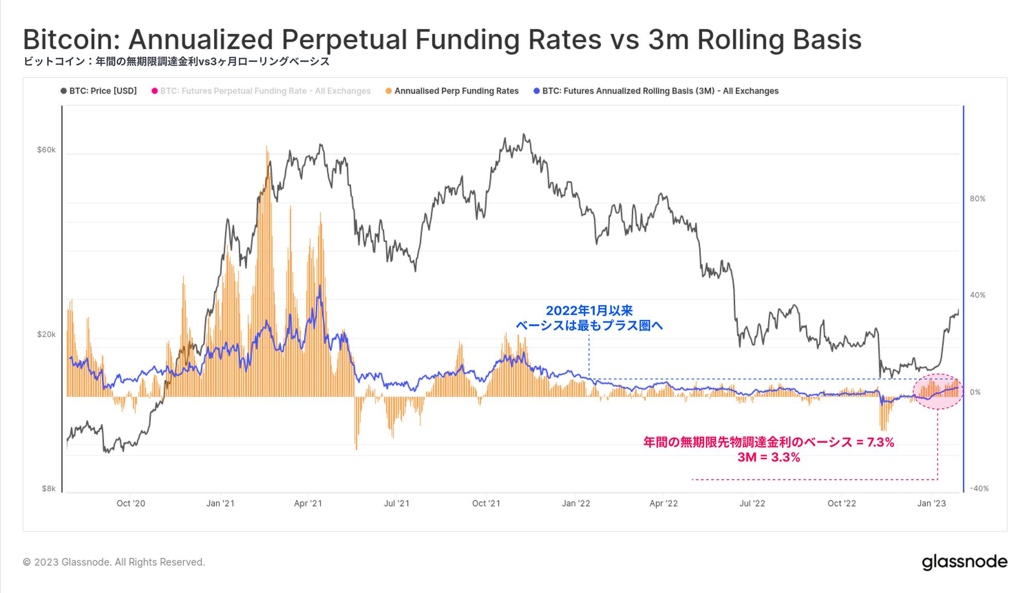 ・市場規模に比して全体のレバレッジが低下しているにもかかわらず、最近先物のショートスクイーズが発生し、先物ベーシスがプラスに転じていること。