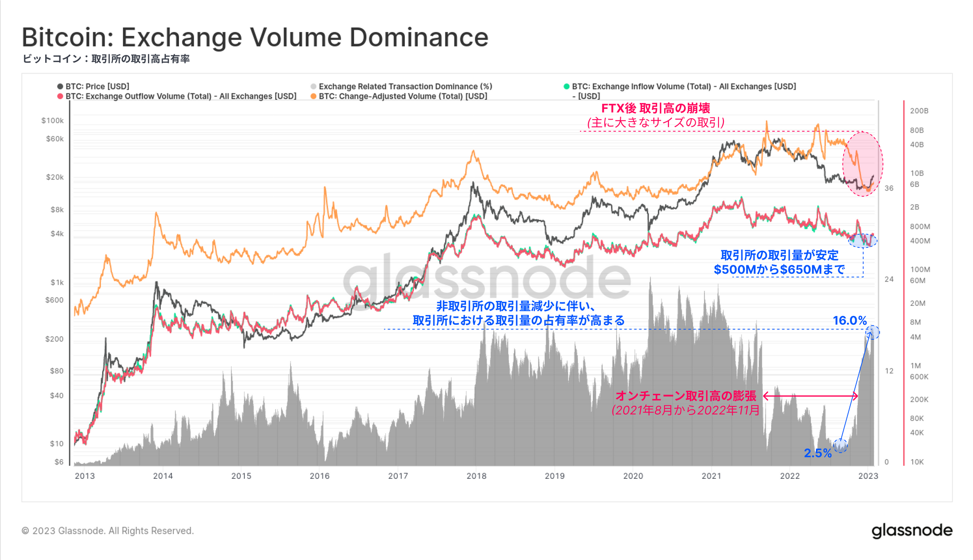 取引所の米ドル建て出金取引量は過去数週間では比較的安定しているものの、取引所関連のオンチェーン取引量の占有率は2.5%から16%超へと相対的に増加している。