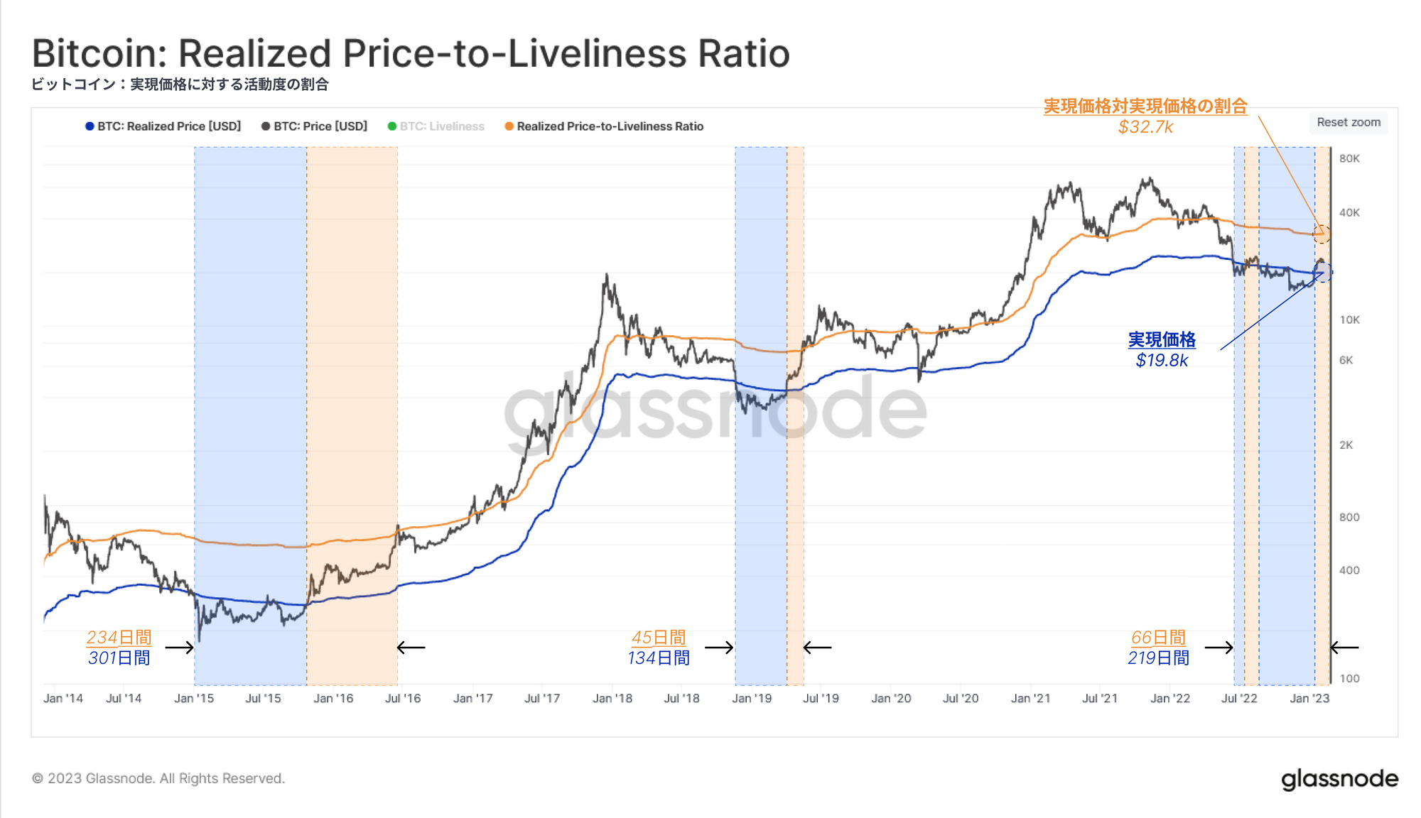 ・上限は、HODLingの程度によって加重された「予想フェアバリュー」を反映した実現価格のバリュエーションである、活動度と実現価格の比率(Realized Price to Liveliness ratio)🟠 ($32.7k)で決定づけられる。