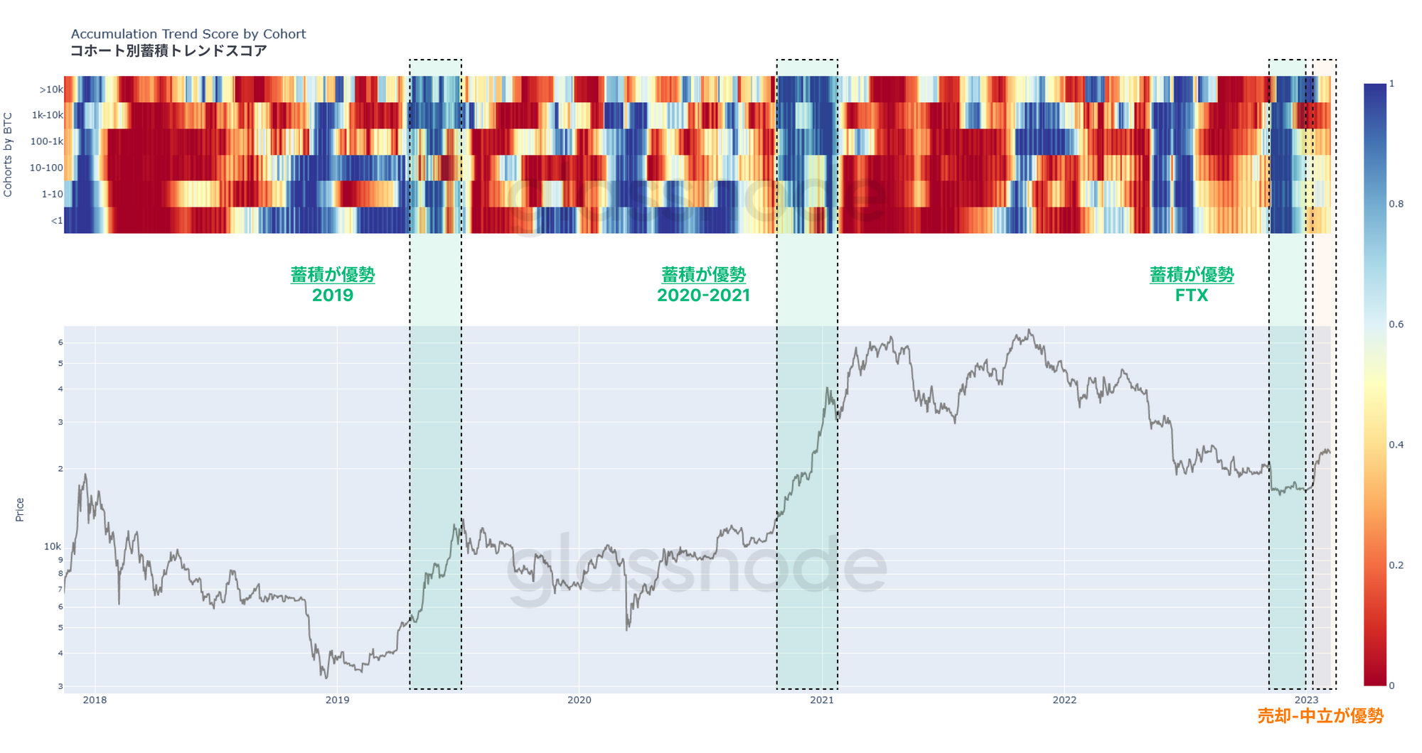 蓄積トレンドスコアの構成要素をさらに詳しく調べると、さまざまなウォレット残高のコホートに対して詳細な分析できる。この数週間ですべてのコホートにおいて、投資家の行動が純蓄積(FTX キャピチュレーション後)🟩から売却-中立**🟧へと変化していることが確認された。