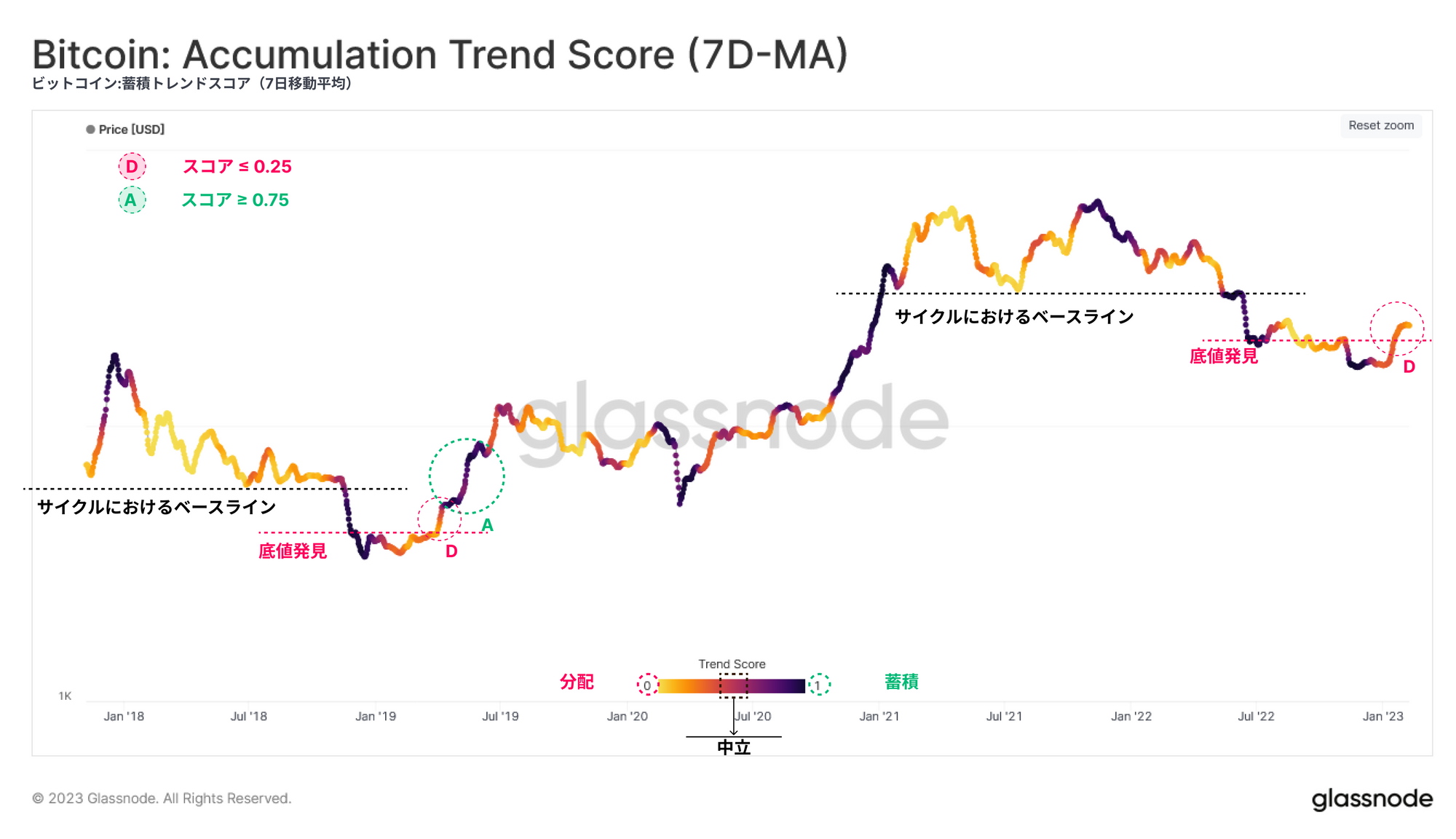 過去の弱気相場と比較すると、同様の底値発見段階からの急反騰は、歴史的に主に安値付近で蓄積エンティティによって、幾分かの売却が誘発されている。最近の急反騰も例外ではなく(🔴D)、この指標は0.25を下回っている。