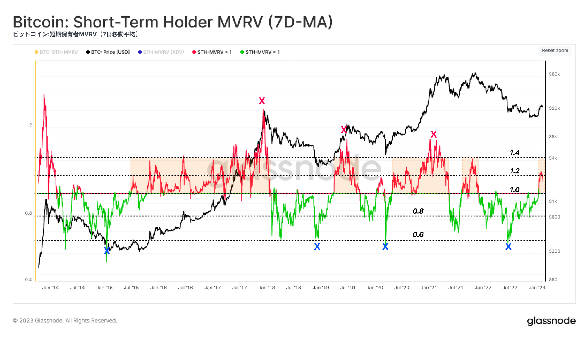 最近の買い手に注目する際には、短期保有者MVRVを使用することで保有されている平均含み益倍率を推定できる。この指標は、オンチェーンコストベーシスに対するスポット価格の比率を測定するものである。この指標の週次平均を使用すると、次のような観測結果が得られる: