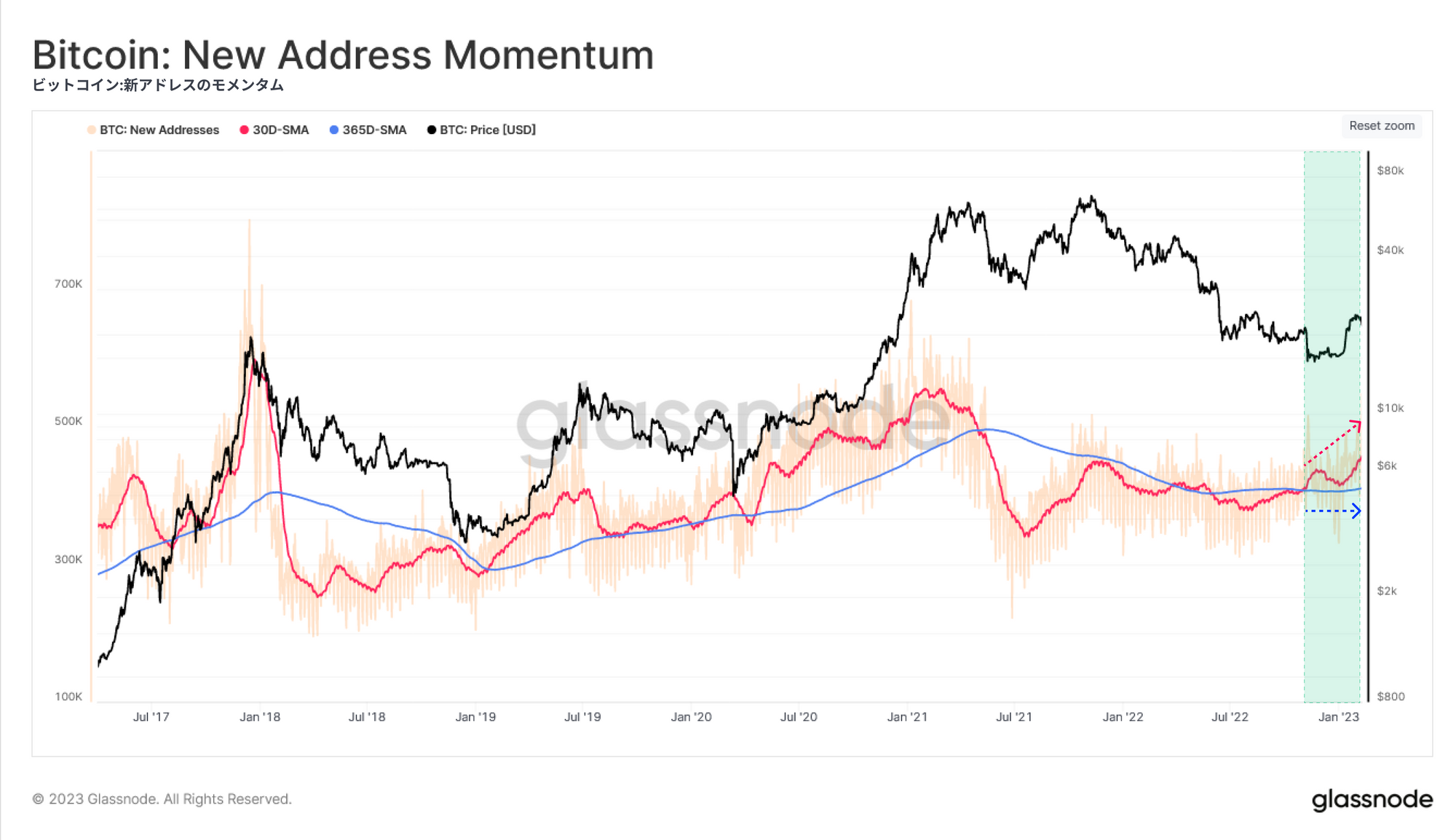 ネットワークに参加した新規アドレスの月平均は、FTXの破産をきっかけとするキャピチュレーションイベント以来、年平均を上回っており、これは建設的な兆候である。この指標は今週2回目の大幅な上昇を示しているが、長期移動平均は横ばい傾向にあり、この活動度の上昇はまだ初期段階であることを示唆している。
