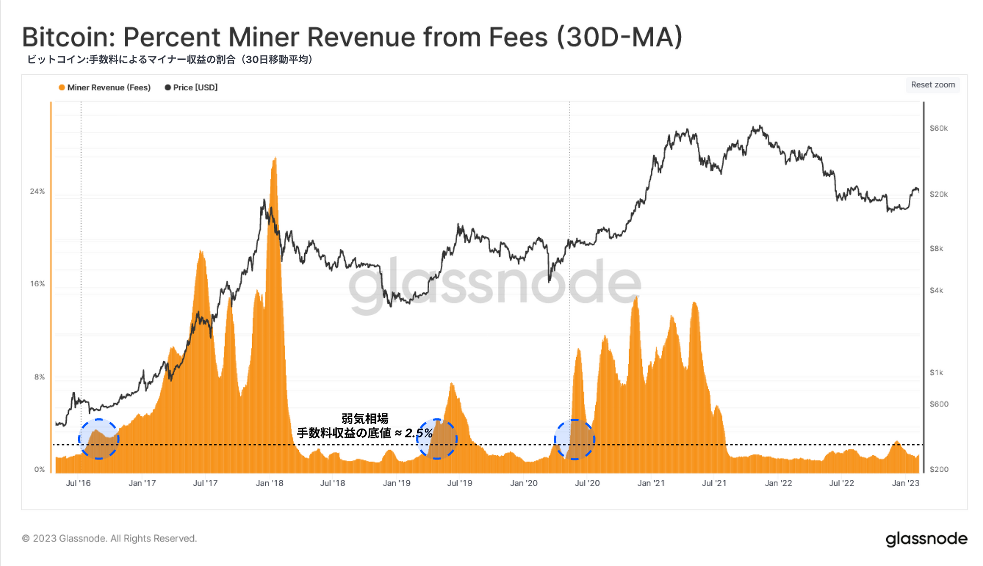 マイナーの手数料収益の月平均を見ると、この指標はまだ弱気相場の手数料における底値レート(2.5%)🔵を大幅に上回っていないことが分かる。