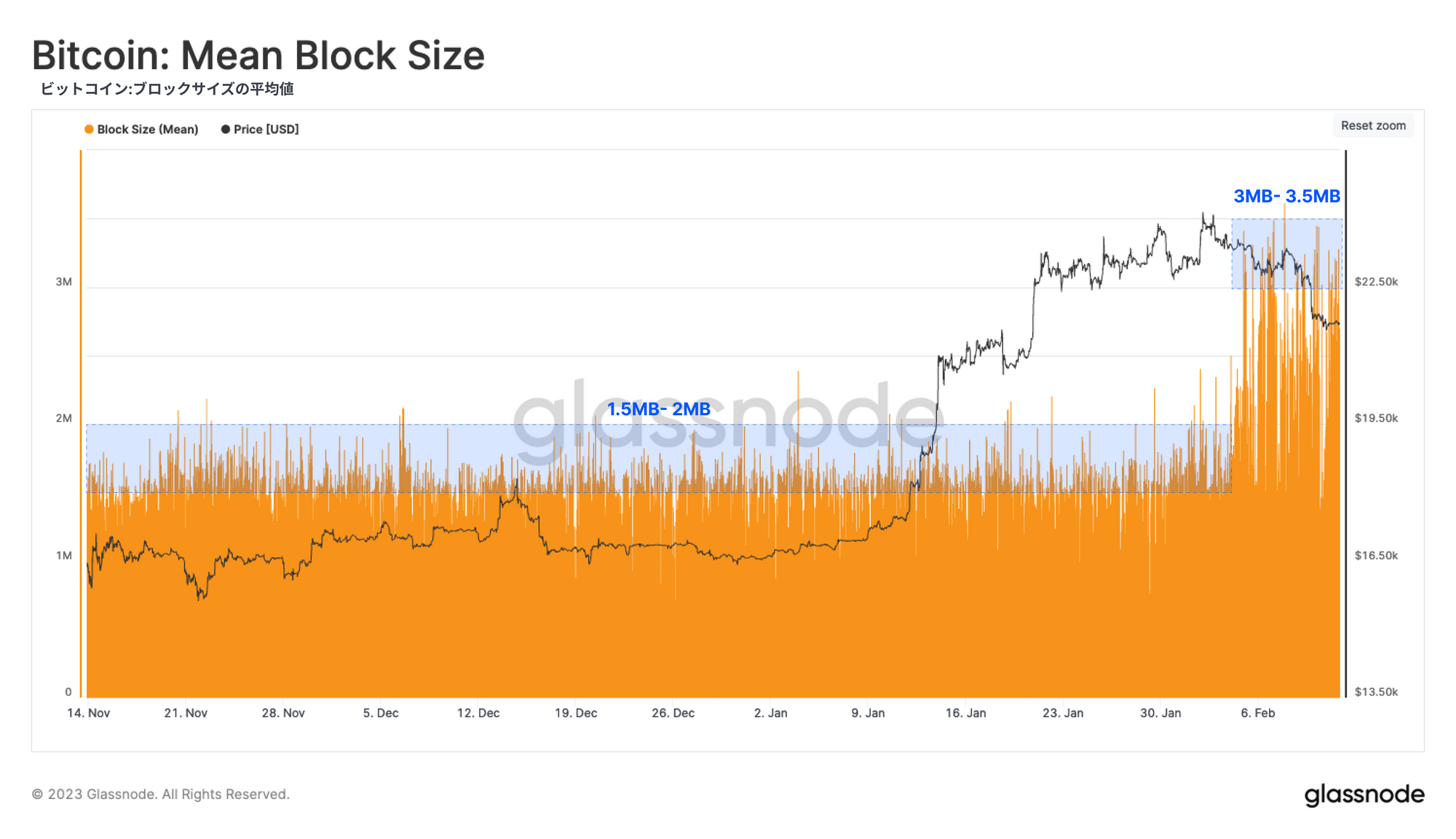 Ordinalsが平均ブロックサイズに与える影響も大きく、平均ブロックサイズの上限は、安定した1.5〜2.0MBから、ここ1週間で3.0〜3.5MBにまで増加している。