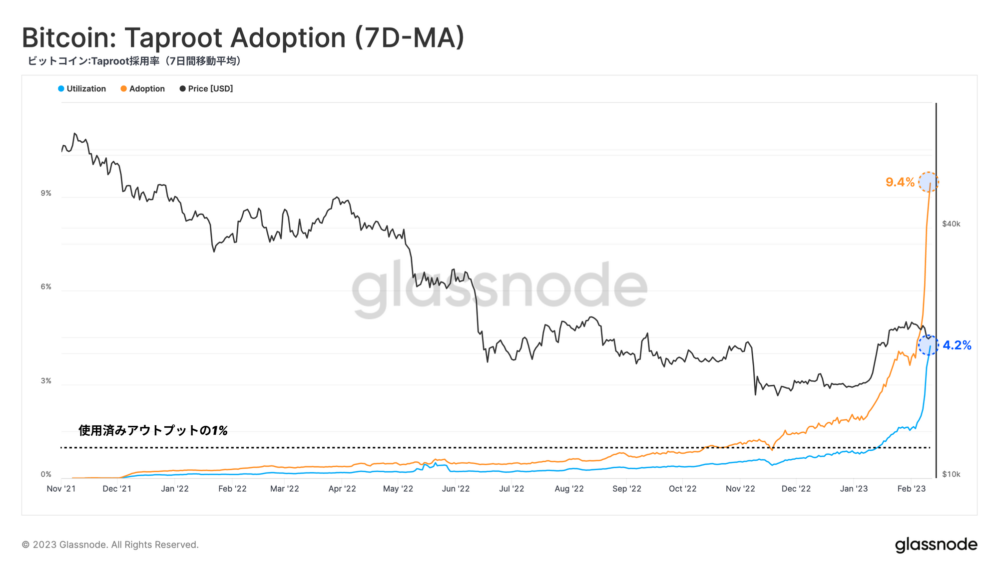 この新たなイノベーションの効果により、Taprootの採用率と利用率はそれぞれ9.4%と4.2%と過去最高を記録した(採用率と利用率の詳細については、当社の調査資料を参考にしてほしい)。