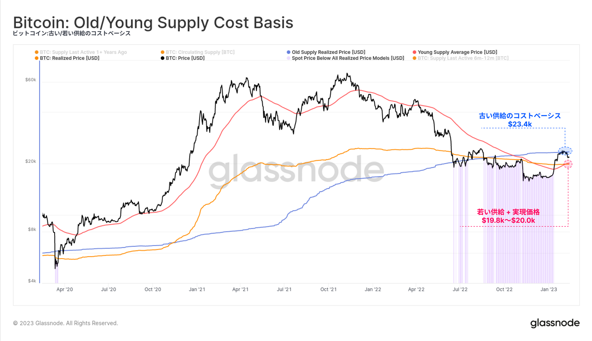 一般的に、ビットコイン市場が極端なレベル(マクロ的なトップやボトムなど)から戻した後、直近で最もアクティブな投資家の行動が市場を動かす要因となる傾向がある。下のチャートは、価格が古い手による供給のコストベーシス$23.4k(>6ヶ月🔵)付近で失速し、実現価格(🟠)と若い手による供給(<6ヶ月🔴)の両方が$19.8kから$20.0kより下に位置していることを示している。