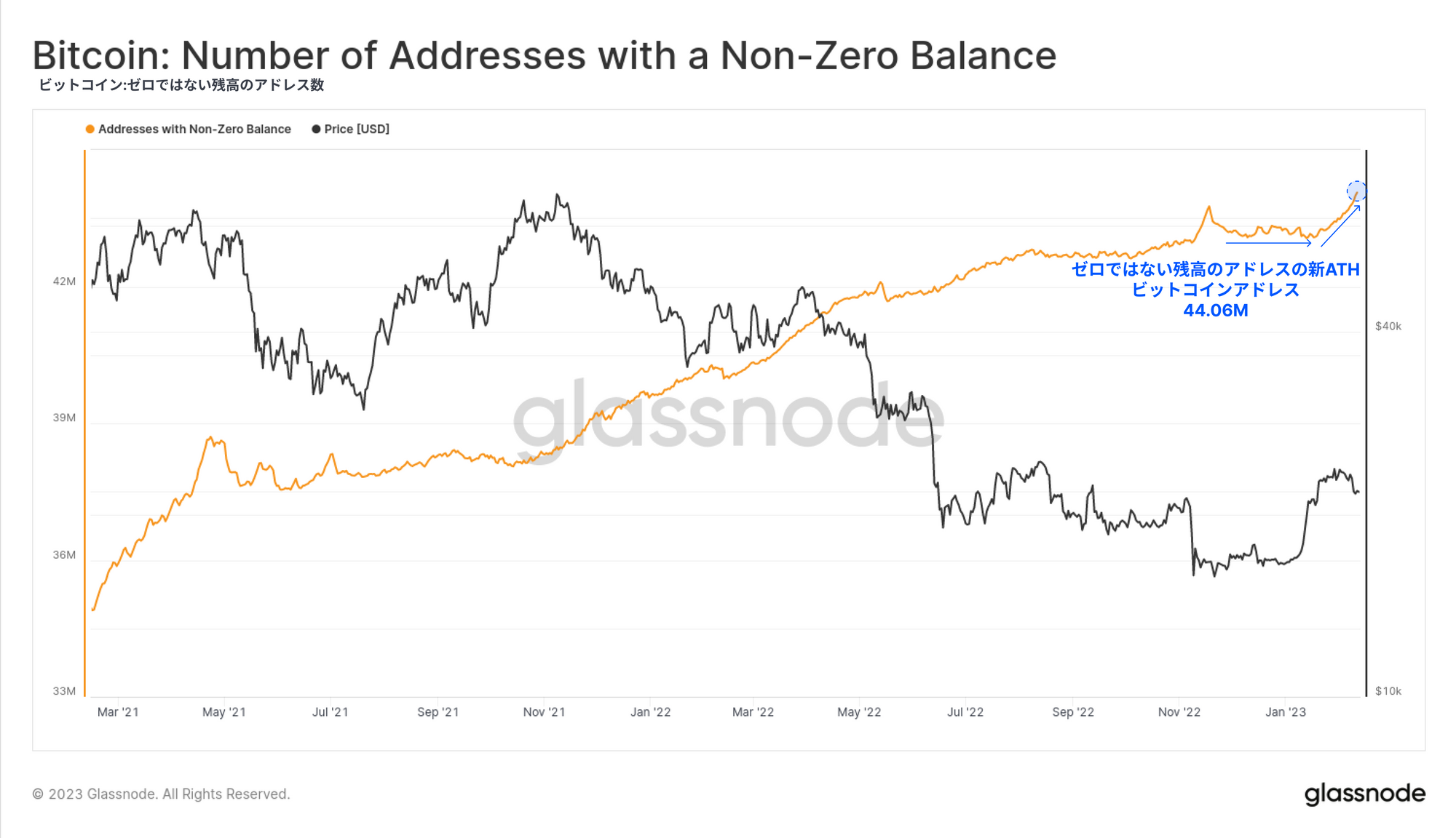 しかし、ゼロでない残高アドレスの合計は史上最高である4,406万アドレスに押し上げられた。これは総じて最近ビットコインネットワークの利用が短期的に増加していることを示しているが、それは必ずしも移動したコインの量という意味ではない。この活動の主な原因はOrdinalsにあり、Ordinalsはコイン量によって大きなペイロードを運んでいるのではなく、データと新規アクティブユーザーによってより大きなペイロードが発生している。