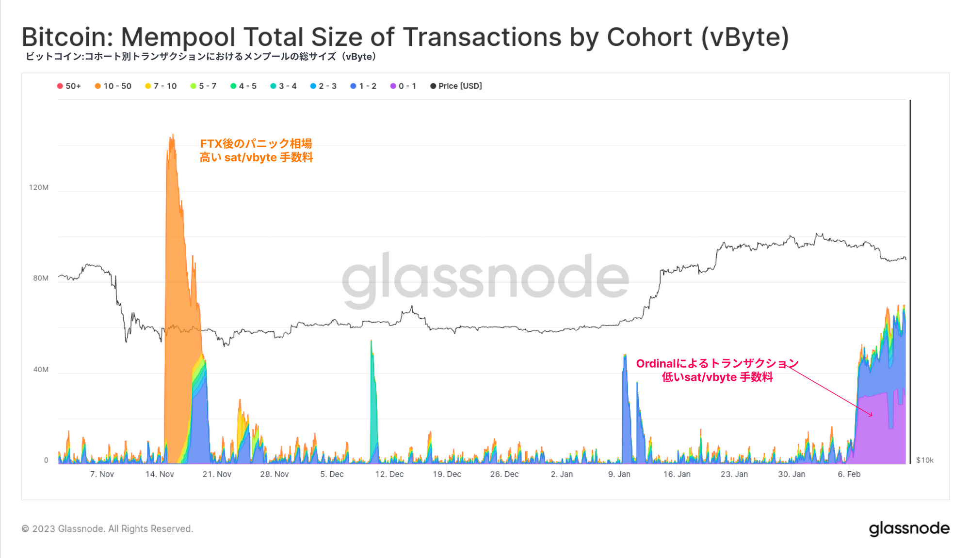 これらの大規模なブロックによって、ビットコインブロックチェーンのサイズや初期ノードの同期時間、メンプールの混雑、および長期における手数料市場の状態に対するOrdinalsの長期的な影響の可能性に関して健全な議論を誘発している。低手数料のトランザクション(0~1 sat/vbyte)が大量に流入し、紫色🟣の我々のメンプールにヒットしているのが確認できる。これは、FTX後のパニック相場では、オレンジ色🟠で示される緊急性の高い高手数料の取引でメンプールが埋め尽くされた状況とは異なっている。