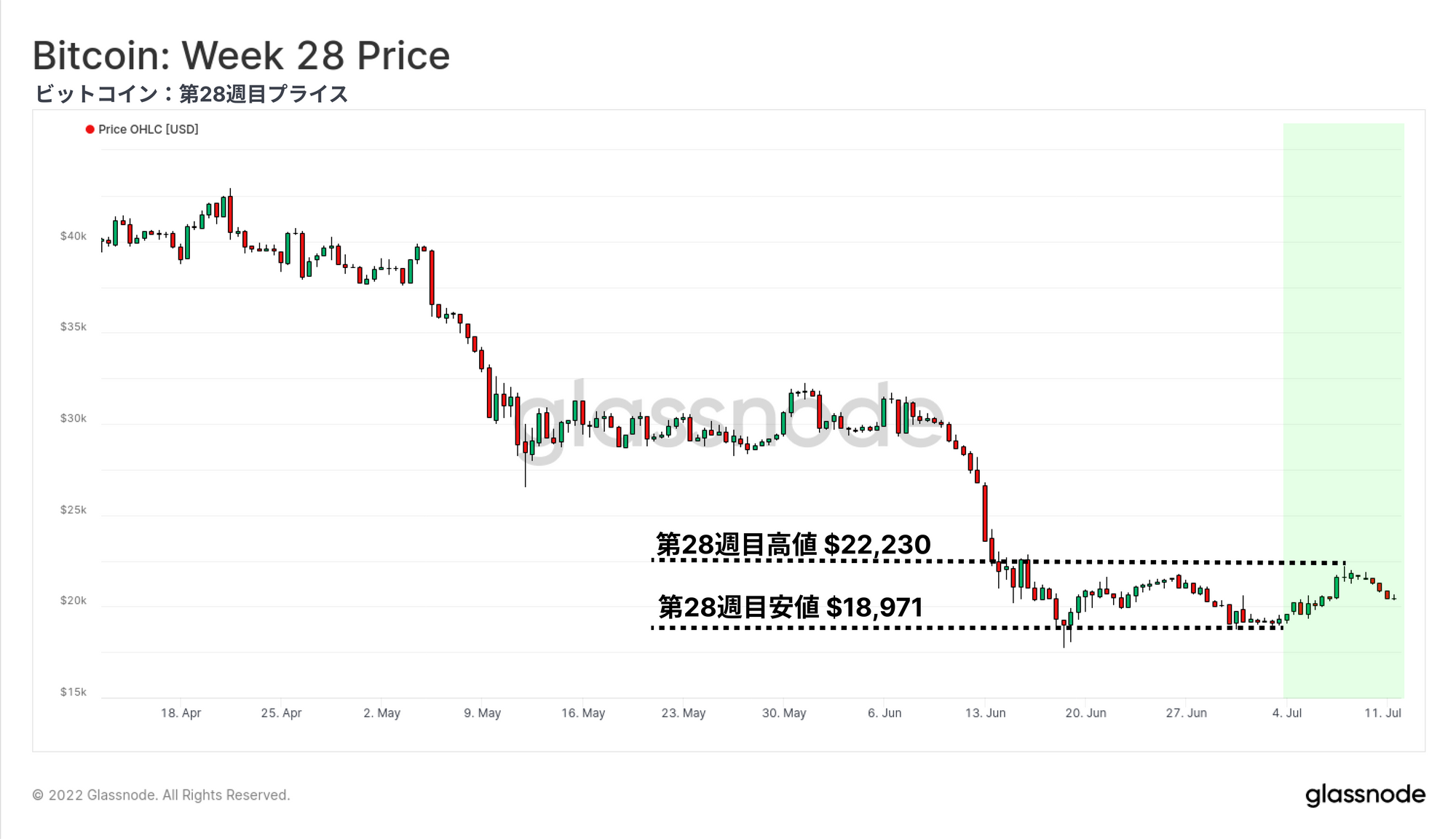 今週のビットコイン価格は、市場が6月の極端なダウンサイドボラティリティを消化する中、20kドルレンジ付近での調整が続いている。価格は上昇しており、週の安値18,971ドルで始まり、22,230ドルでピークを迎えた。