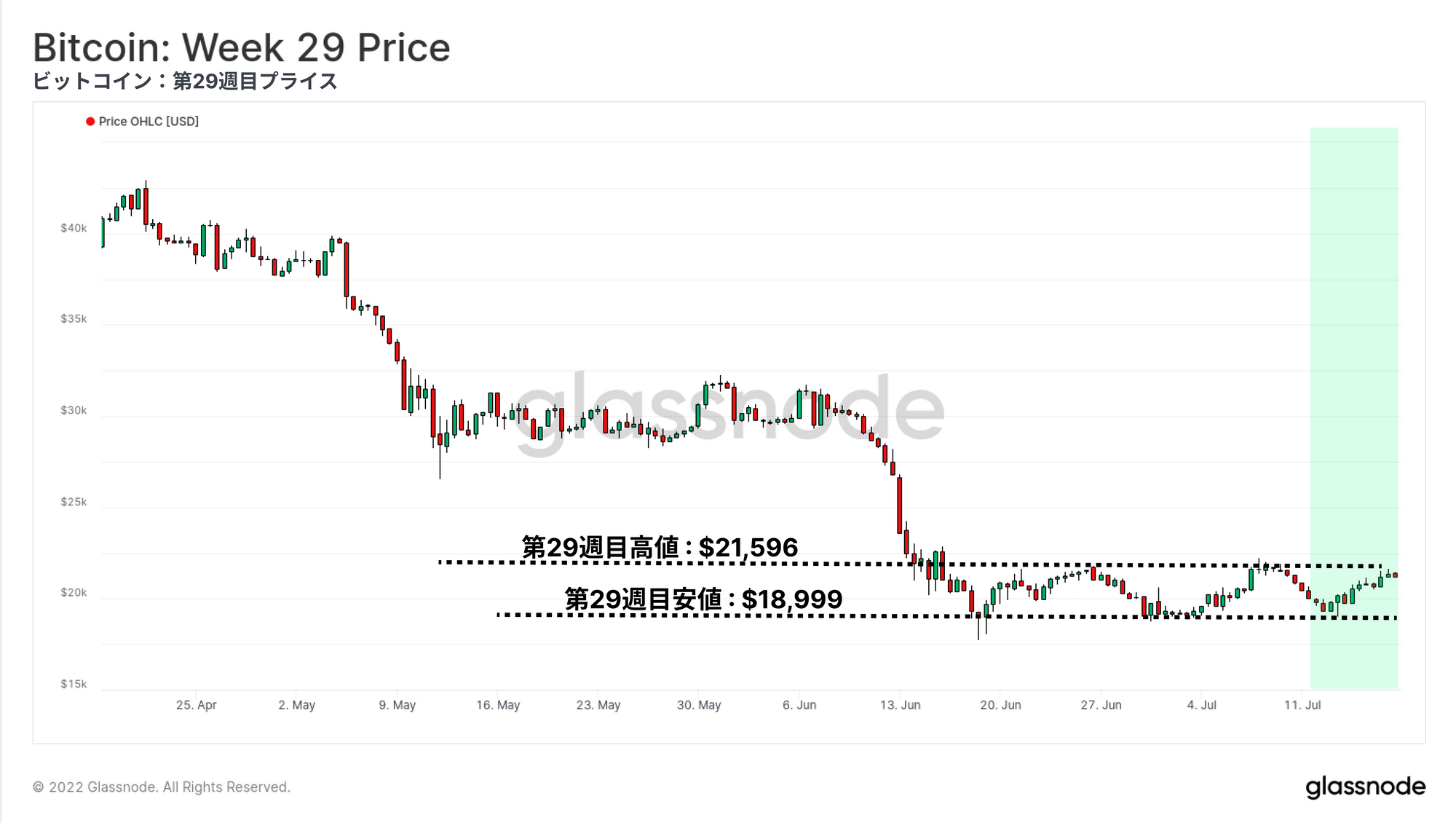 今週のビットコイン市場は、18,999ドルからレンジの上限である21,596ドルまで上昇し、一服した。これは、週明けに米国が公表したCPIインフレ率が40年ぶりの高水準となる9.1%を記録したことを受け、市場全体がボラタイルな動きとなったことに起因する。また、世界各国における国民の不安の拡大、エネルギー価格の上昇、資源の不足など、厳しい背景がある。