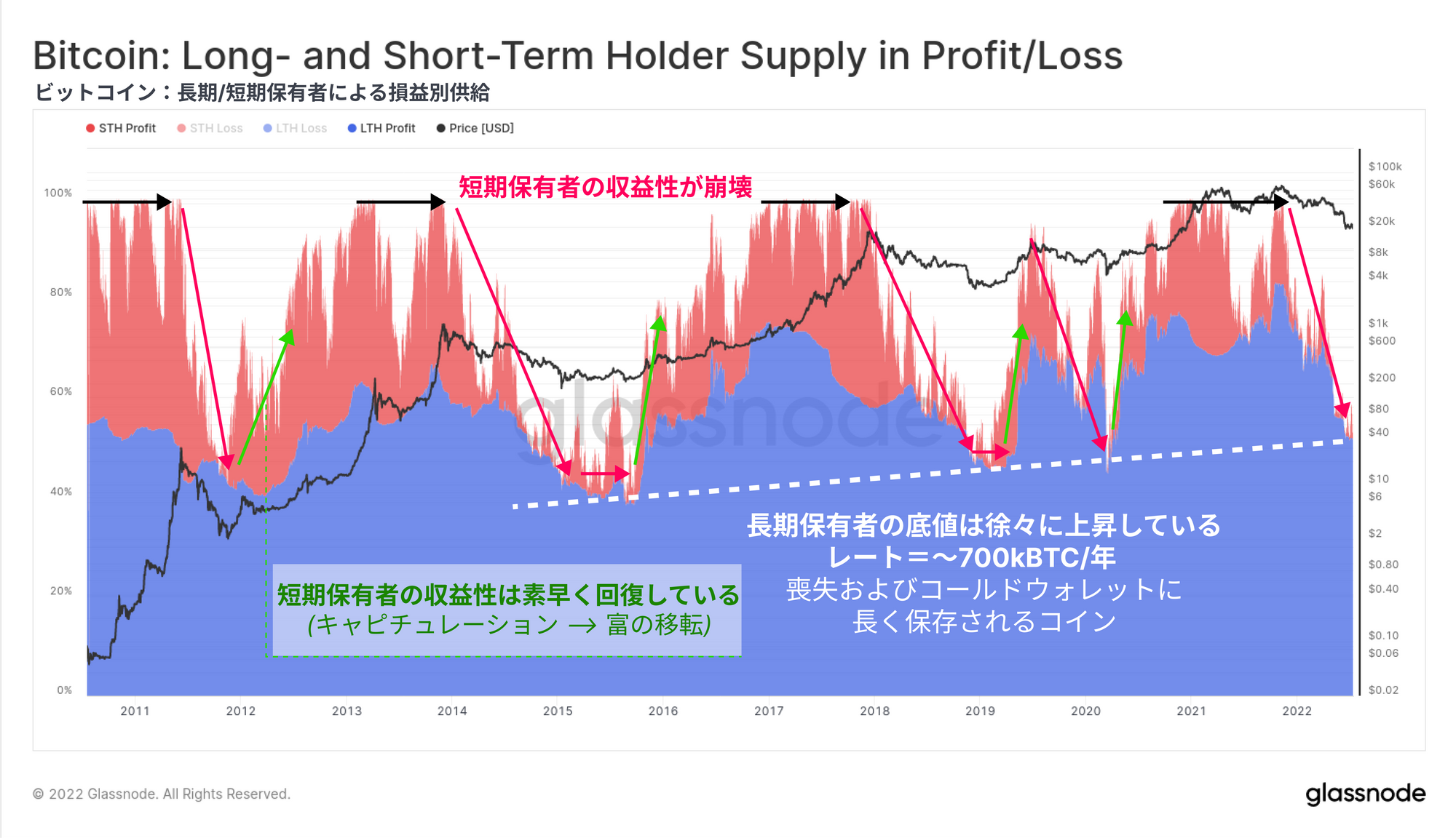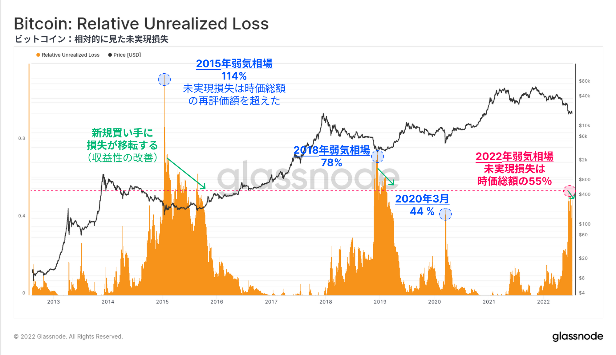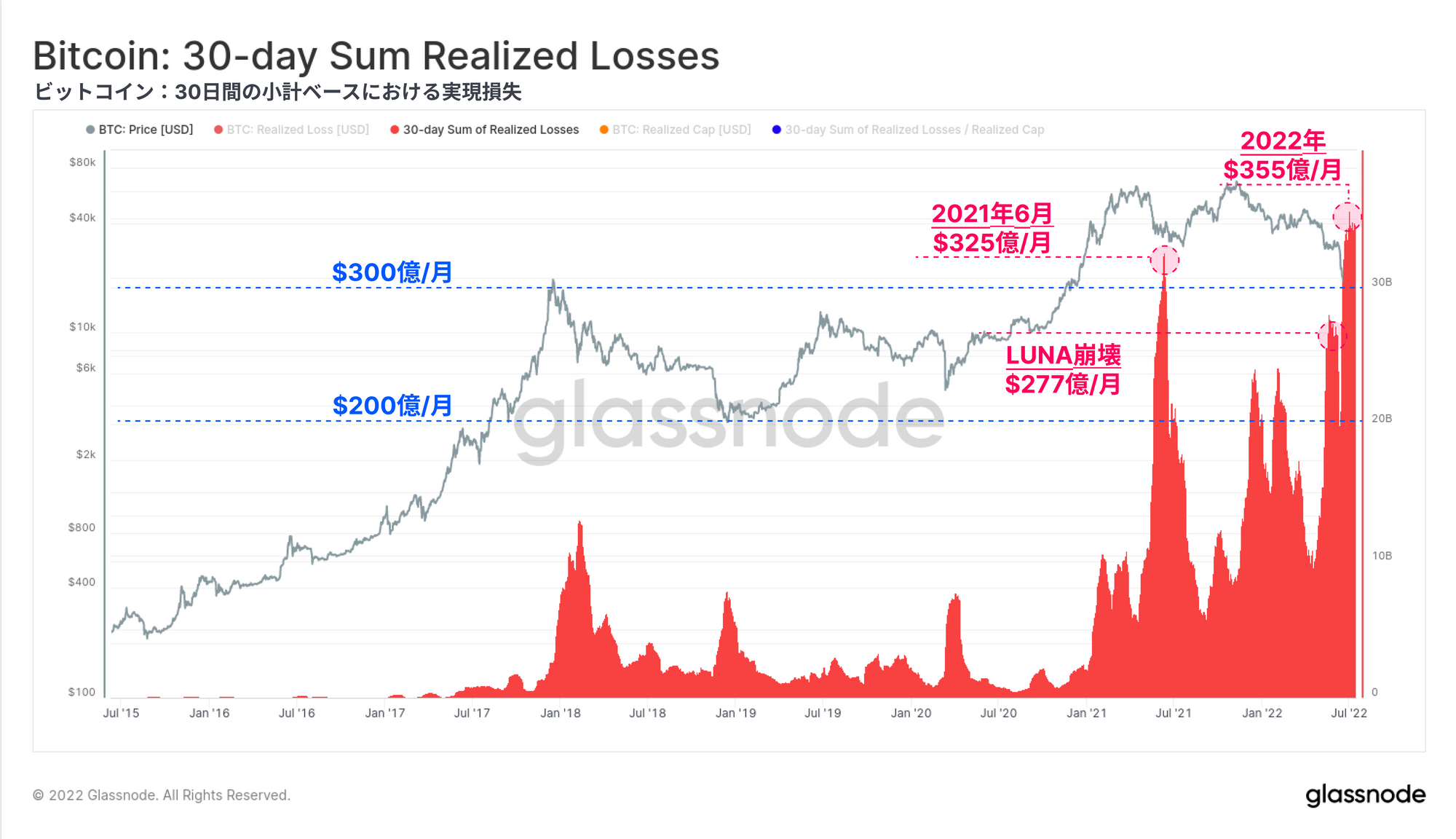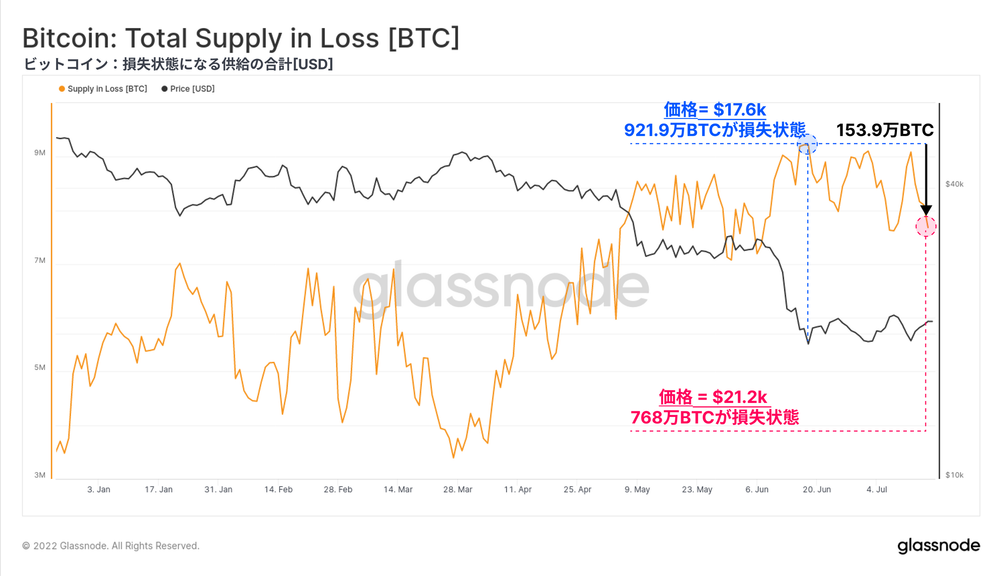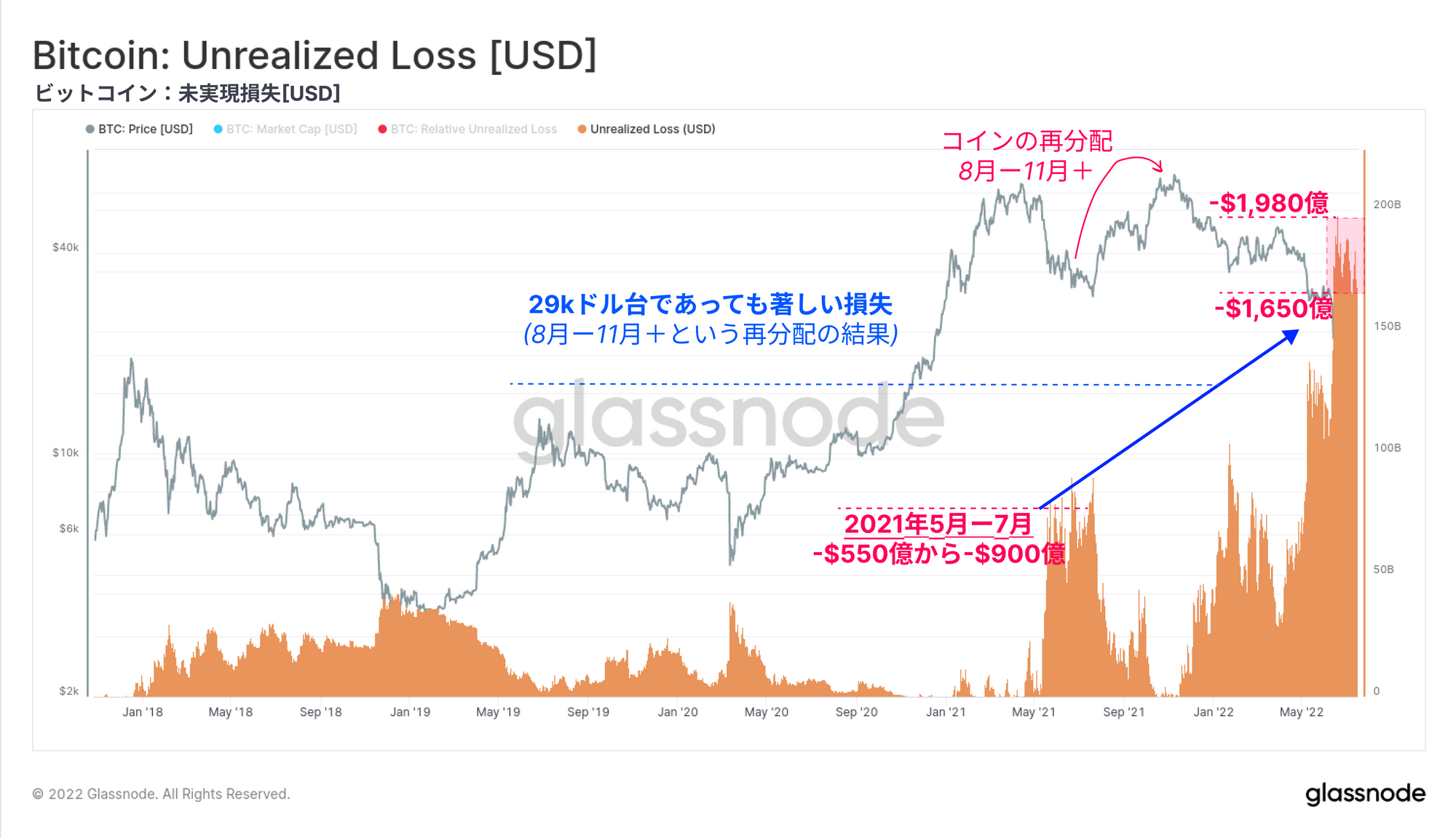 今回は、様々な投資家コホートによる未実現損失(保有コイン)と実現損失(売却コイン)の両方を通じて、現在のビットコイン市場構造を研究する。この研究の目的は、過去の弱気相場における底値と比較して、同程度の売り手の疲弊が起こっているかどうかを測定することである。これらのツールは、20kドル前後で形成される弱気市場の底値のケースと確立を構築するのに役立つ。