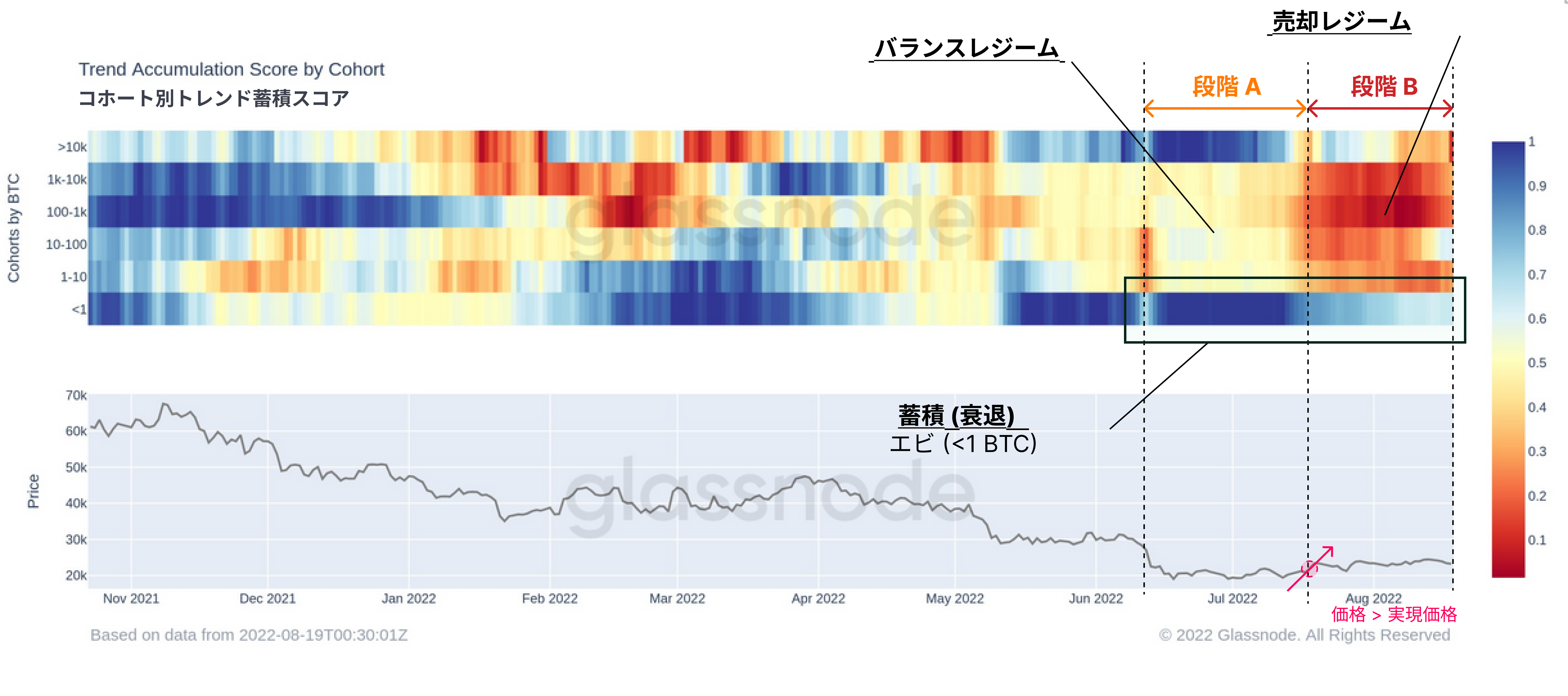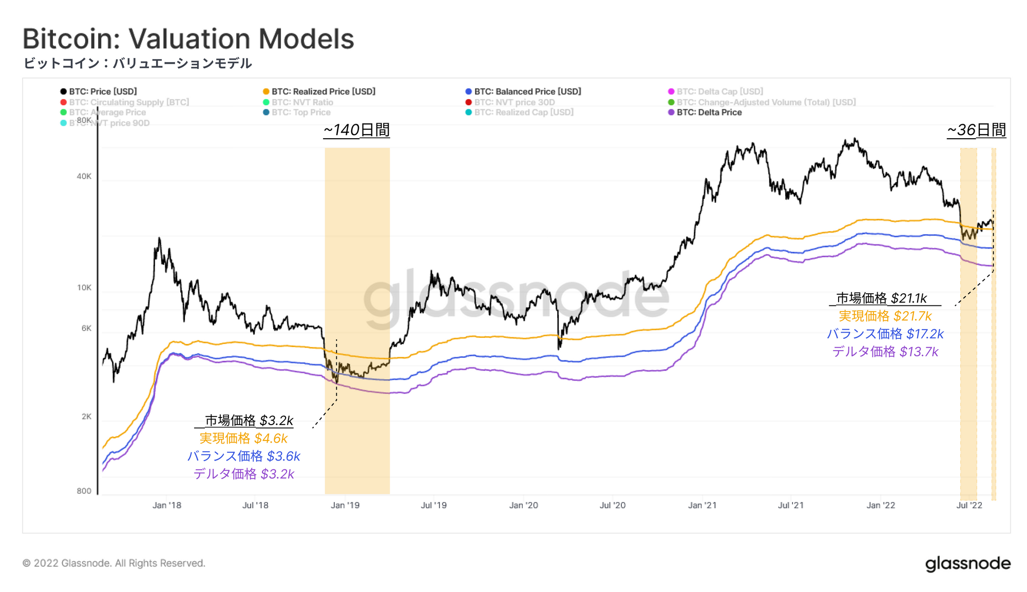 現在、実現価格は21.7kドルで取引されており、スポット価格は実現価格をわずかに下回る21.3kドルで取引されている。2018-2019年の弱気相場では、価格は140日間実現価格を下回って変動しており、実勢弱気相場期間が36日間と比較的短いため、より多くの蓄積時間が必要である可能性を示している(今週のオンチェーン第28週目で述べた)。