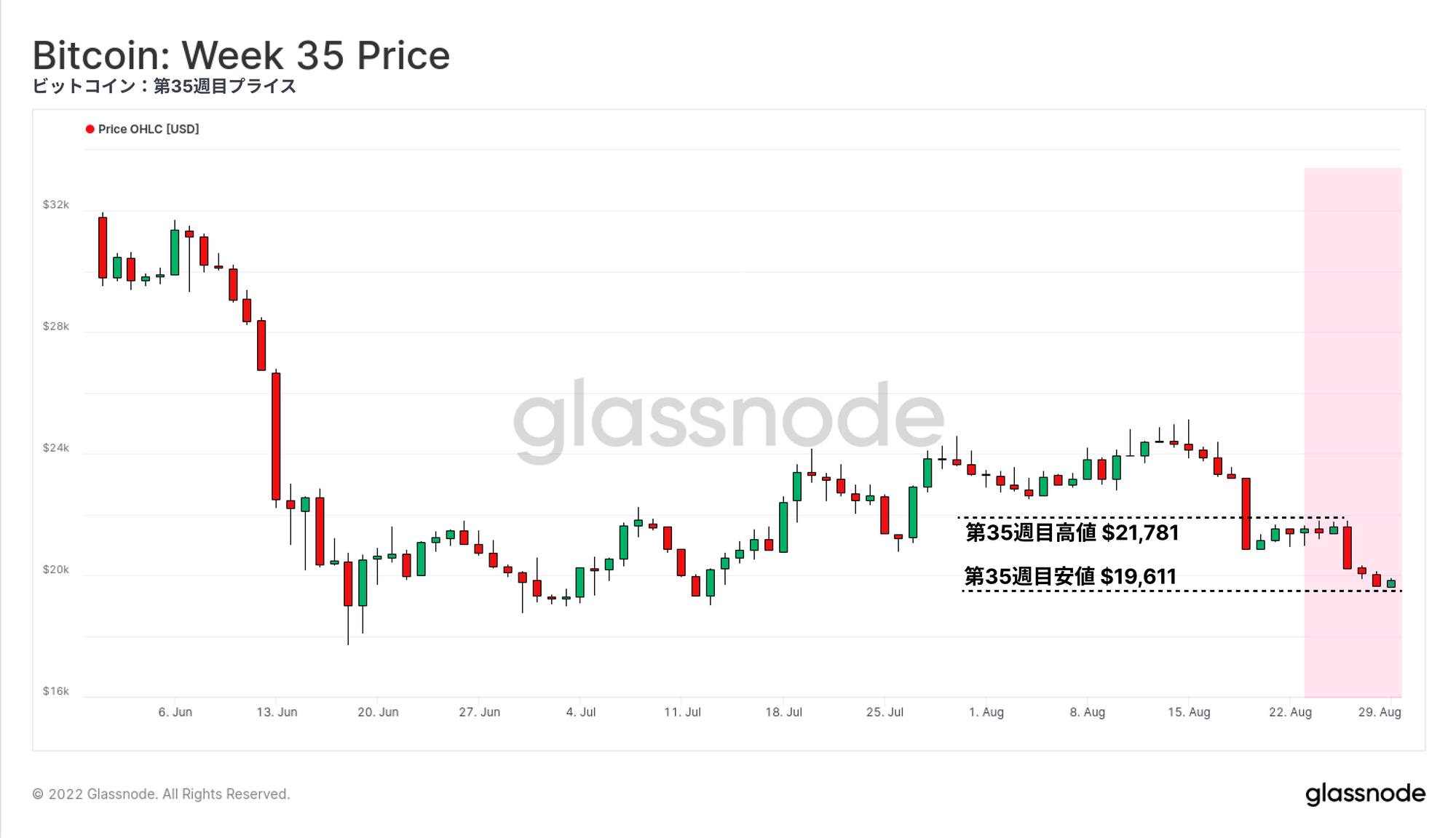 ジャクソンホールで米連邦準備制度理事会がインフレに対してタカ派的なスタンスを示し続ける中、世界的な流動性の指標として発展しているビットコインは、それゆえに反応した。今週の相場は、21,781ドルの高値から下落し、19,611ドルという数週間ぶりの安値を付けた。