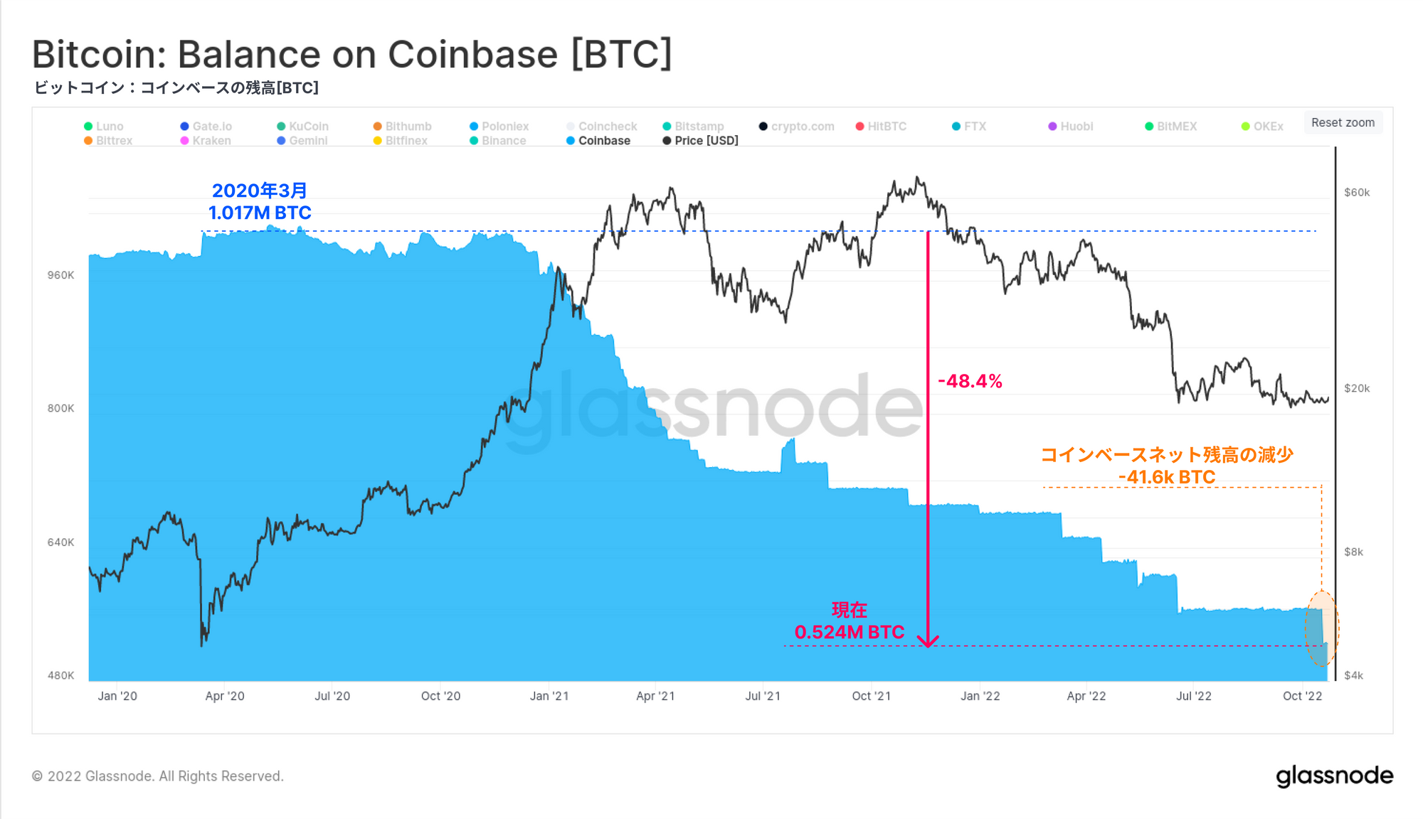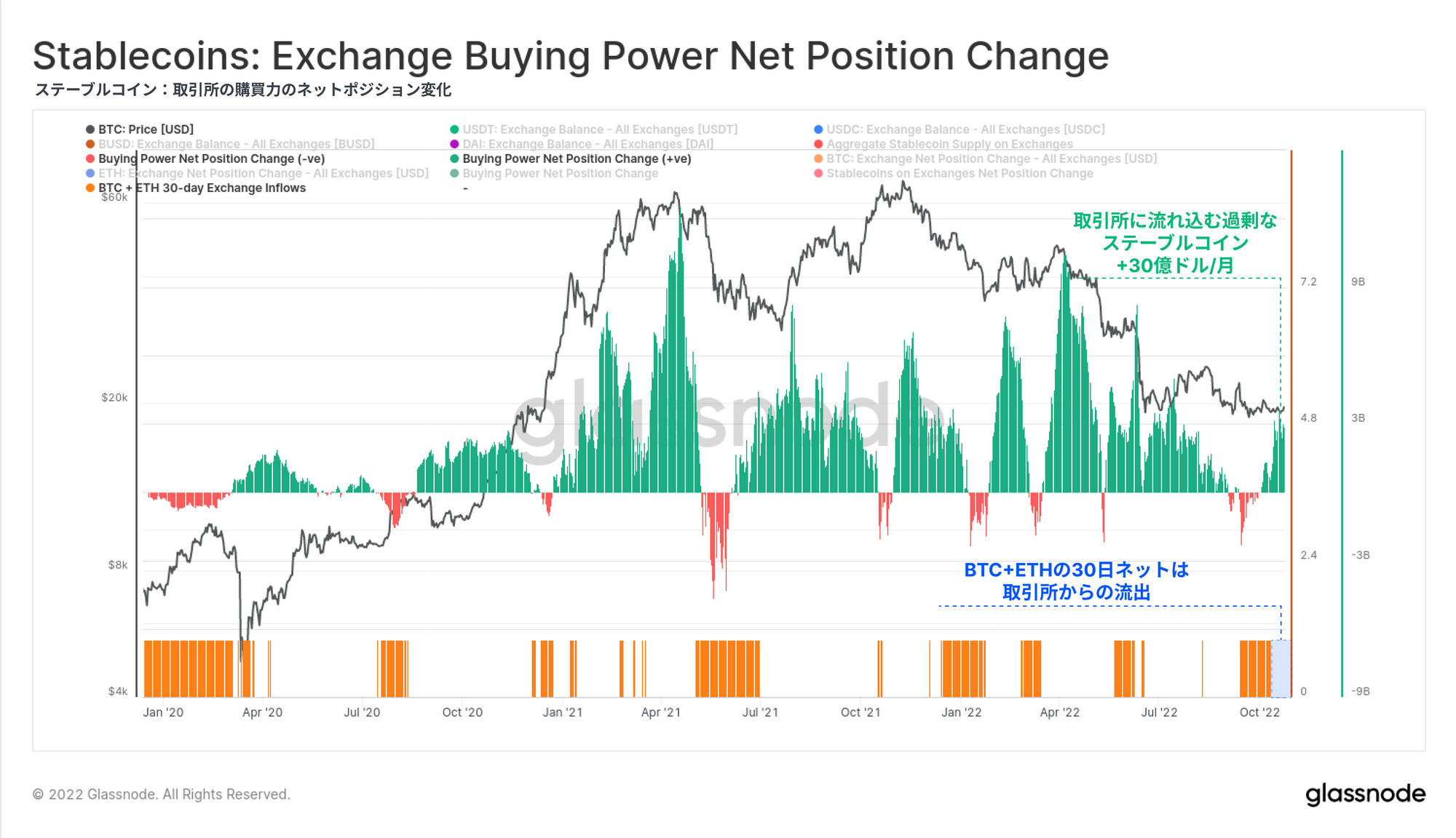 ・取引所のBTC残高は減少を続けており、一方、ステーブルコインの購買力は毎月30億ドルを超えて流入している。