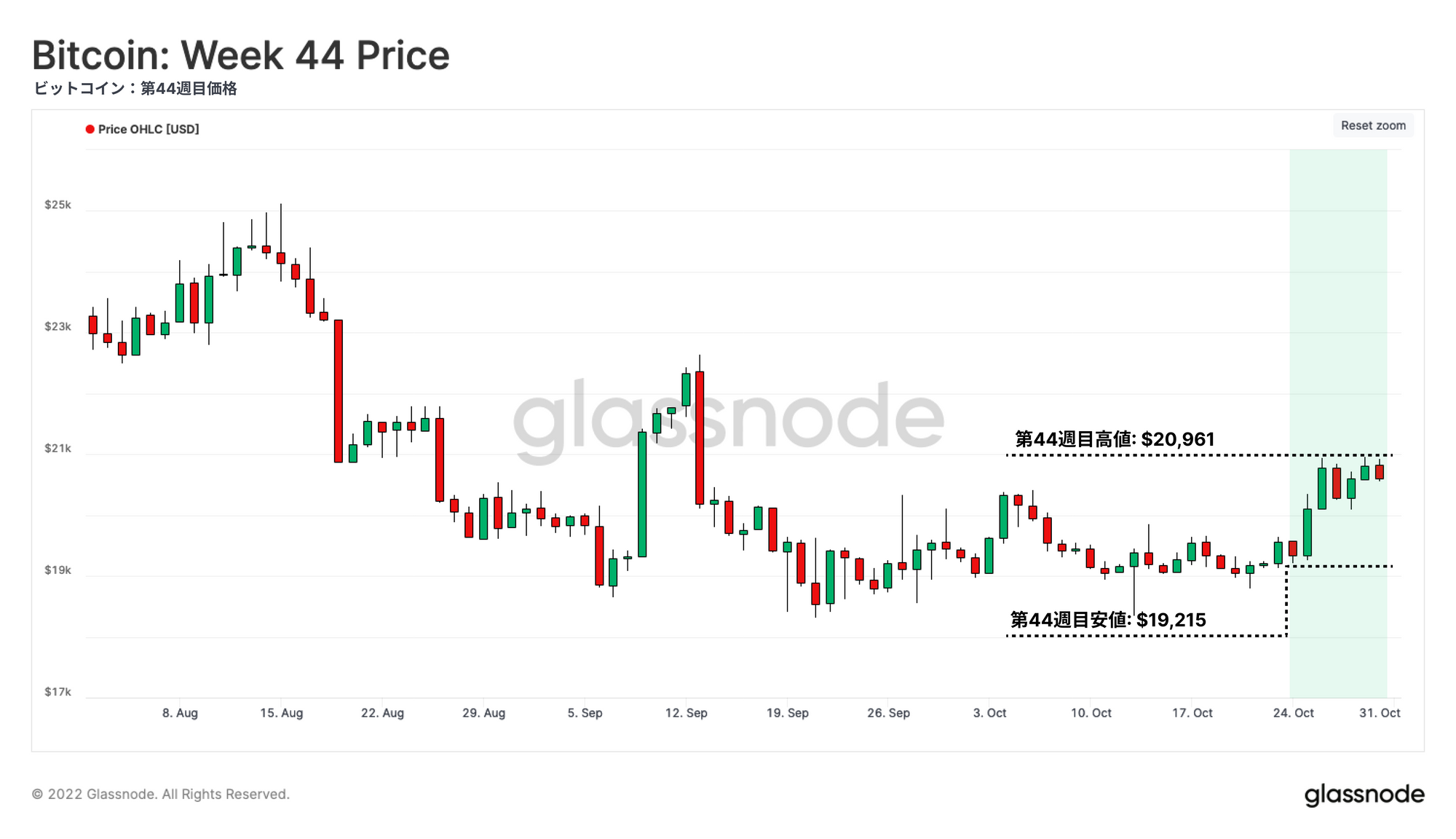 今週、ビットコインは安値19,215ドルから押し上げられたのち20,961ドルの高値まで取引され、20kドルのレベルまで再び反発した。これは、9月上旬以降から一層狭いレンジで膠着した後の何ヶ月ぶりかの上昇である。