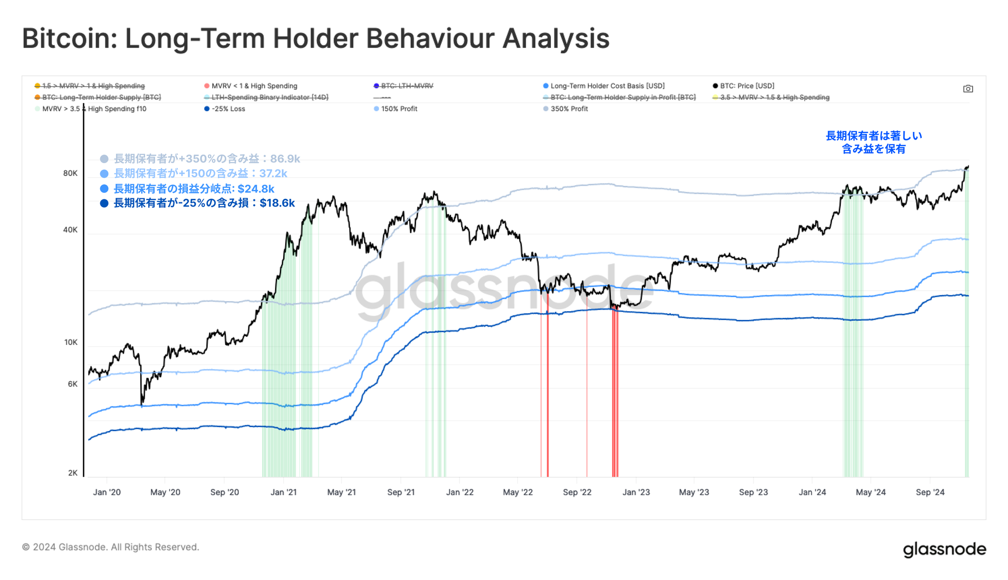 ・利益確定(🟩): 長期保有者が+350%以上の含み益を保持し、売却が増加する局面。