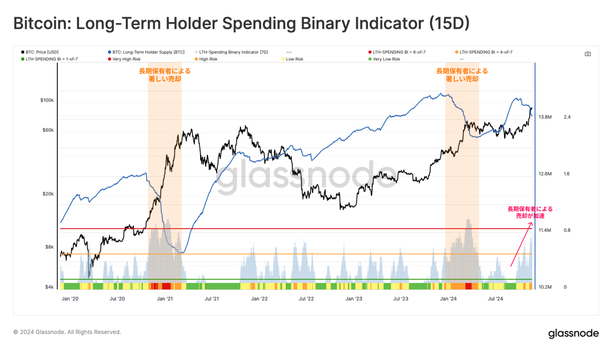 これは、2021年3月と2024年3月の最高値付近で見られた規模にはまだ達していないものの、長期保有者による売り圧力の高まりが際立っている。