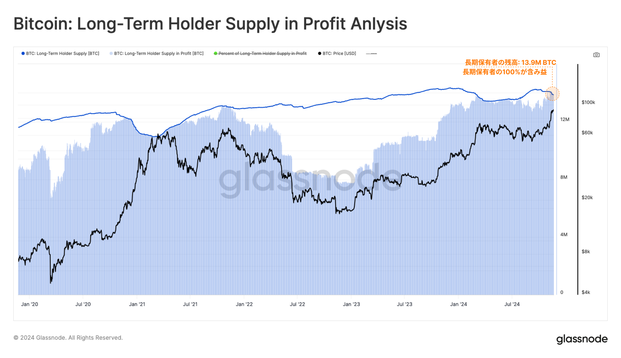 ビットコインが$75.6kを突破したことで、長期保有者が保有する14M BTCの100%が含み益に転じており、売却を誘った。これにより、ATHからのブレイクアウト以来、+20万BTCという著しい残高の減少につながった。