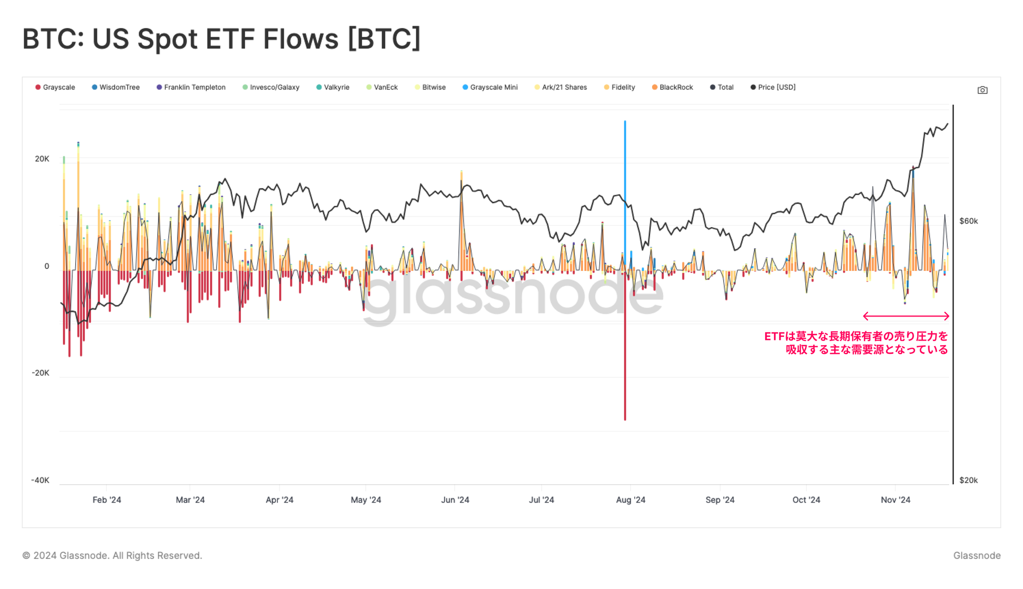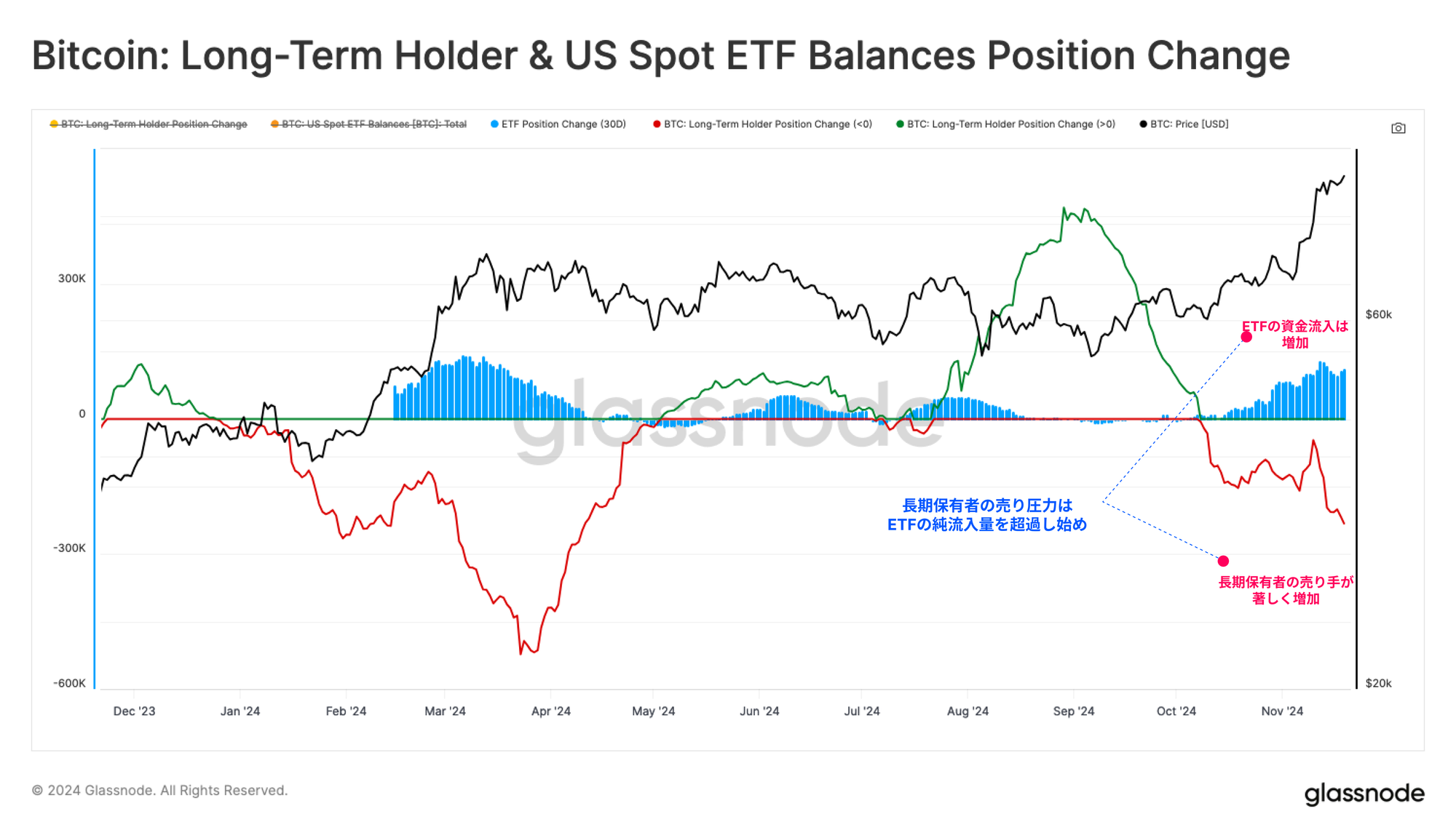 しかし、11月13日以降、長期保有者の売り圧力がETFの正味の流入量を上回り始めており、2024年2月後半で見られていた、需給のアンバランスさが市場のボラティリティを高め横ばい相場となったパターンを再現している。