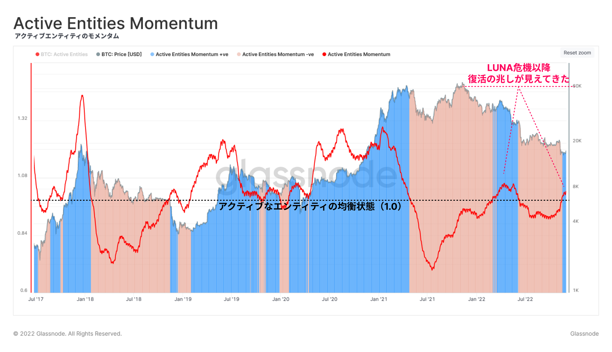 エンティティモメンタムが均衡のしきい値に対して高水準で推移していることは、心強いことである。