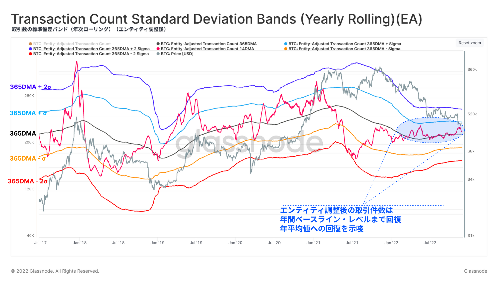 続いて、取引件数指標(エンティティ調整後)における年次ローリング標準偏差バンドを紹介する。これは、すべての確認済みの取引の14日単純移動平均線と±2σの範囲にある一連の統計バンドをプロットしたものである。