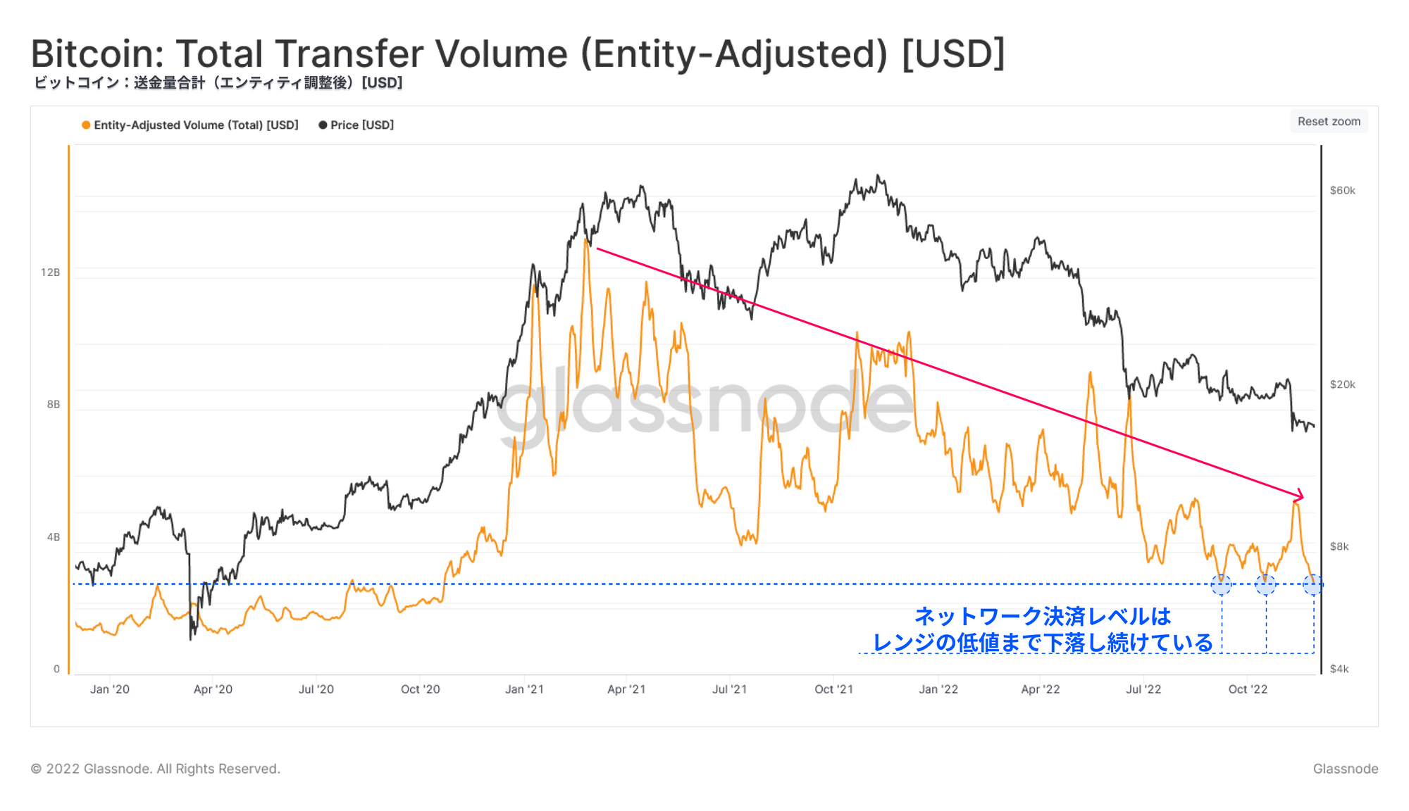 現在の決済量はサイクルの最低値を試しており、取引回数やユニークエンティティが改善しているにもかかわらず、送金のためのネットワークの利用が依然として乏しいことを示唆している。