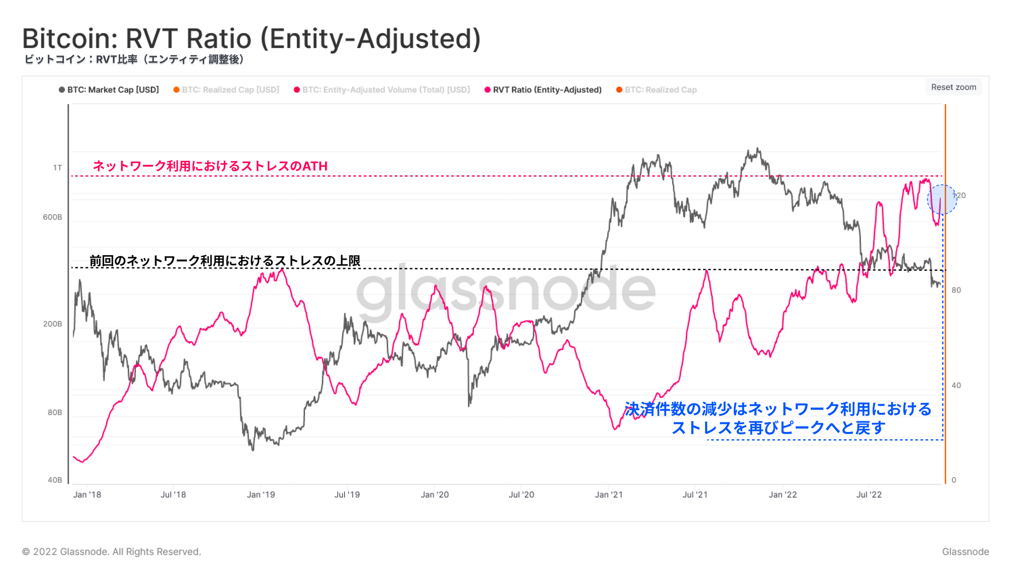 これに対してRVT比率という指標を使ってさらに詳しく分析すると、ネットワークはピークに近い使用率不足であることがわかる。これは、上記のような大幅な資本流出の後でも、ビットコイン実現総額が送金量に対してまだ比較的高いことを示唆している。