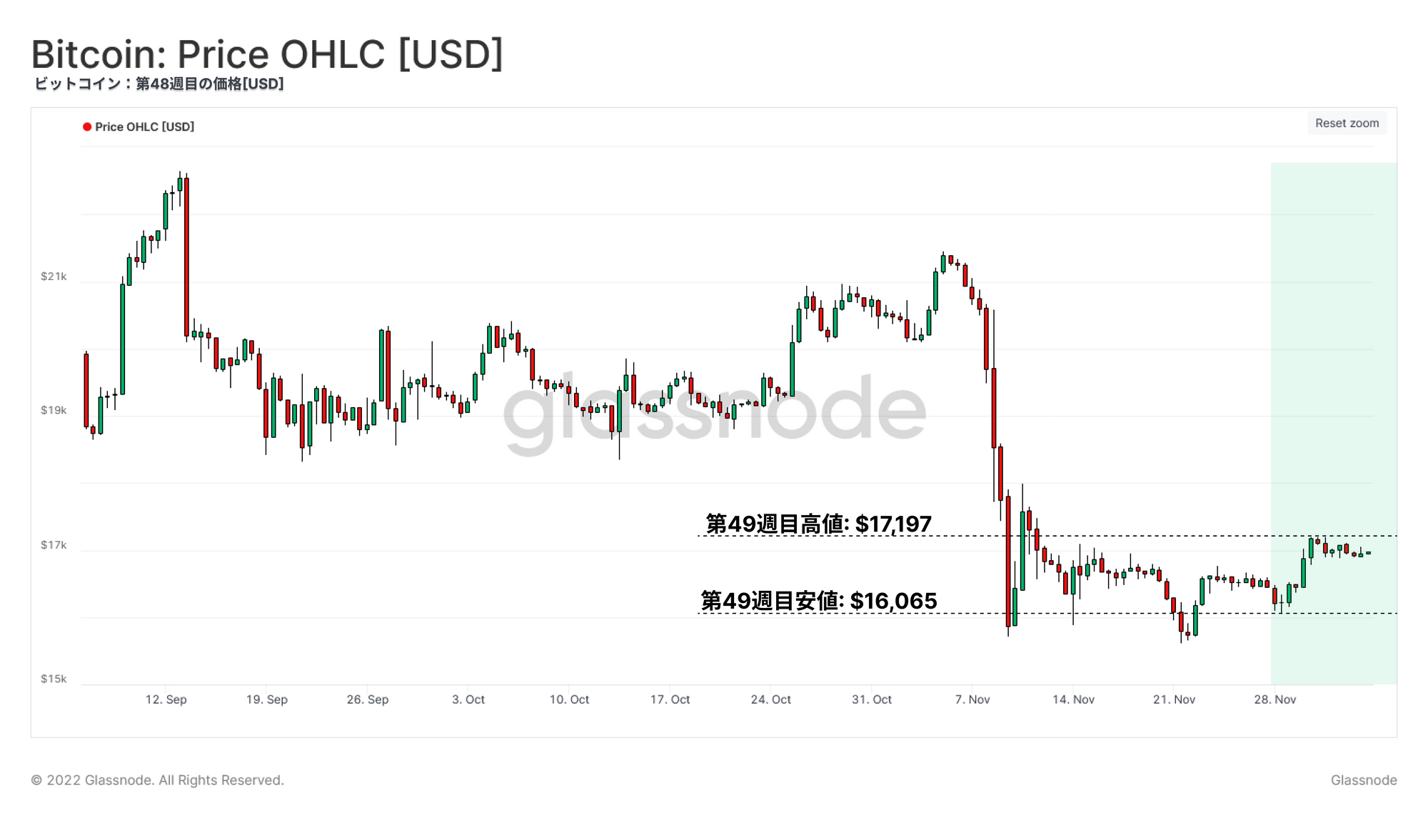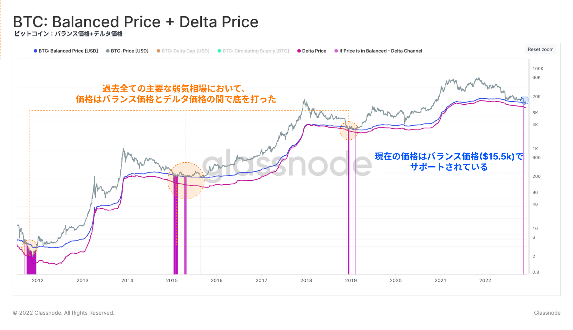 現在の市場に関しては、15.5kドルから12.0kドルの範囲にある。価格は、FTXの崩壊が始まったときに一時的にこのチャネルに入っただけで、その後デルタ価格の上がサポートラインとなった。