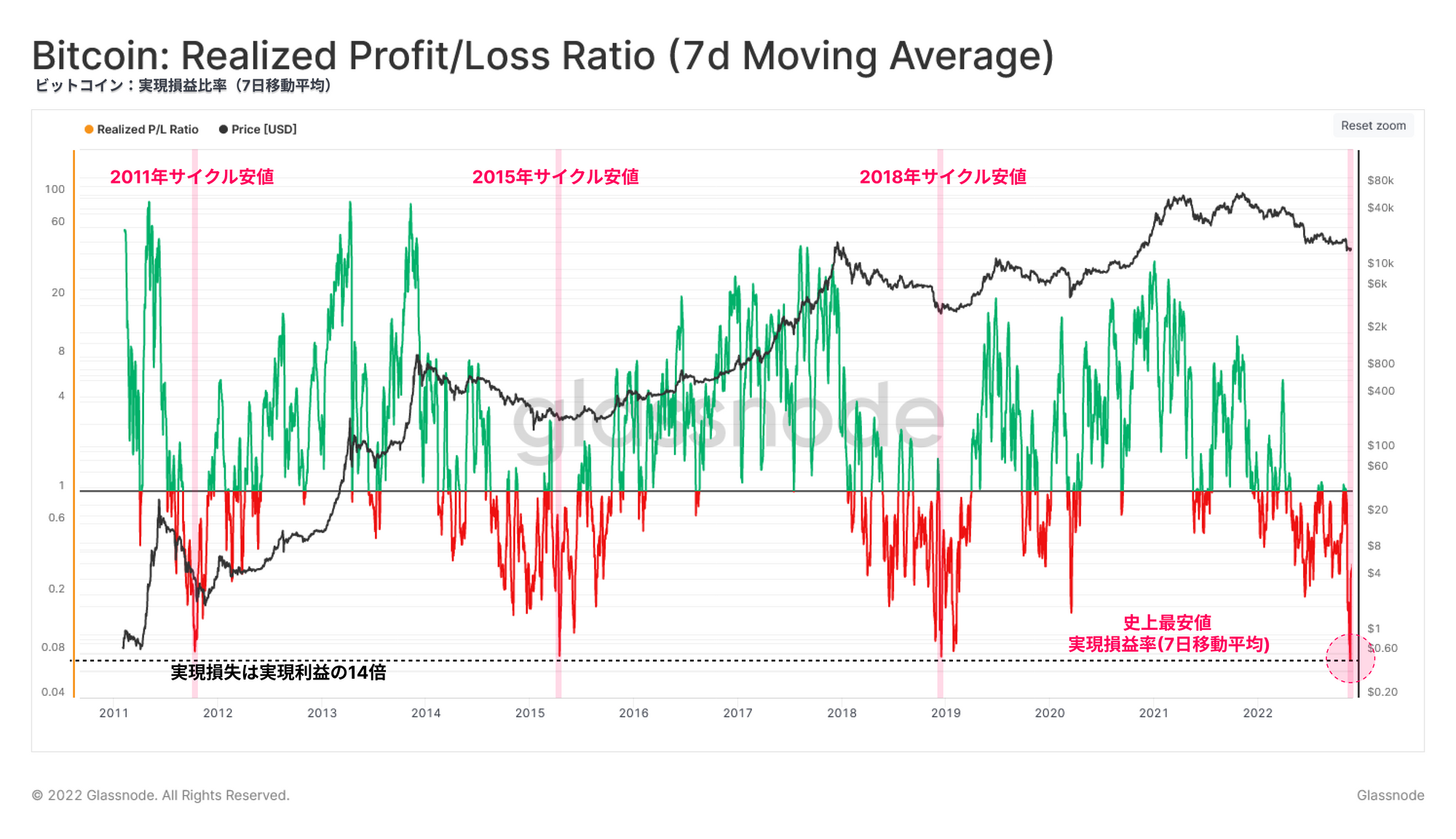 過去6ヶ月間にわたってビットコイン投資家が経験した実現損失は、歴史的な大きさであった。収益性に対するストレスはイベント後に減少し始めているが、過去18ヶ月間で高まっていたすべての過剰流動性を完全に一掃する結果となった。このことは、2021年の投機プレミアムが完全に消失したことを示唆している。
