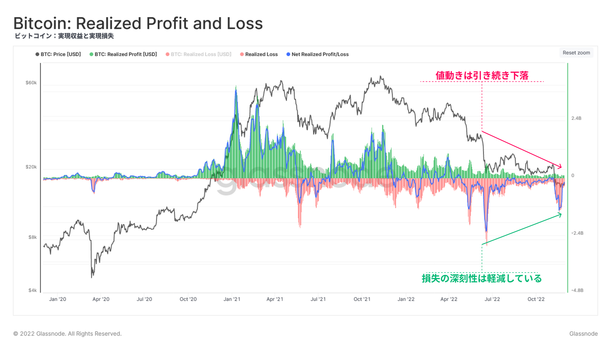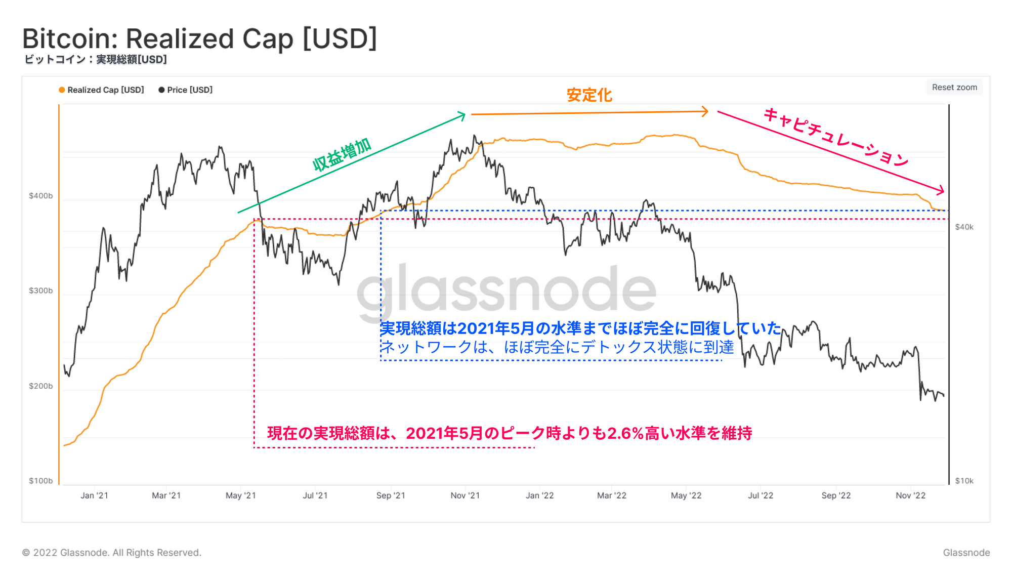 2021年半ばの売り相場の後、実現総額において著しい上昇が見られている。これは、市場参加者が上昇局面で大きな流動性の出口を確保したため、利益を実現し、実現総額を増加させたと解釈できる。