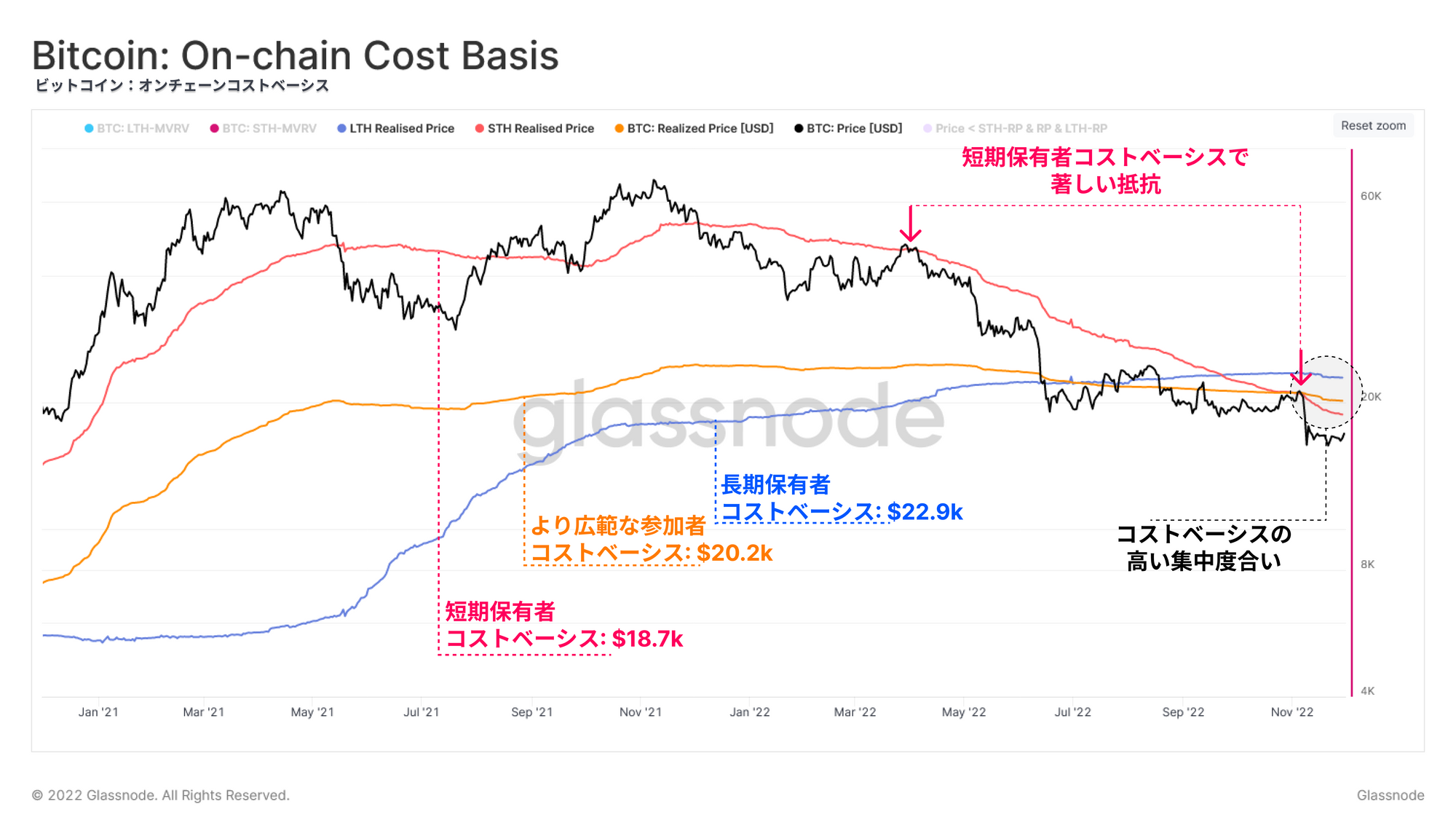 短期保有者のコストベーシスは、11月に大量のコインが売買されたことを示すように、ここ最近は大きく下降している。また、すべてのオンチェーンコストベーシスが$18.7kから$22.9kの範囲に集中していることも確認できる。