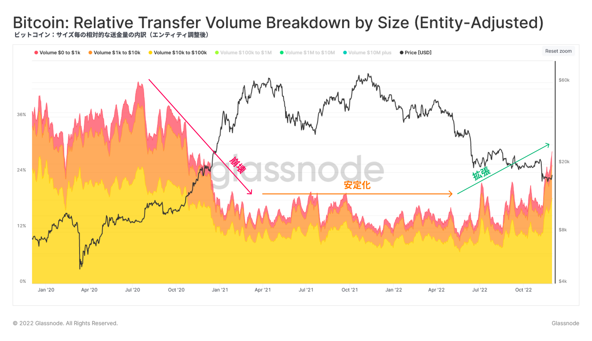 取引件数は回復しているものの送金量が減少しているということは、小口送金が増加し、大規模のエンティティの占有率が低下していることを反映していると思われる。相対的な送金量の内訳を見ると、小口取引(10万ドル以下)の割合が約35%に増加していることが確認できる。これは2020-22年のサイクル全体を通じて比較的安定していた10%から12%というレベルを脱却したことになる。