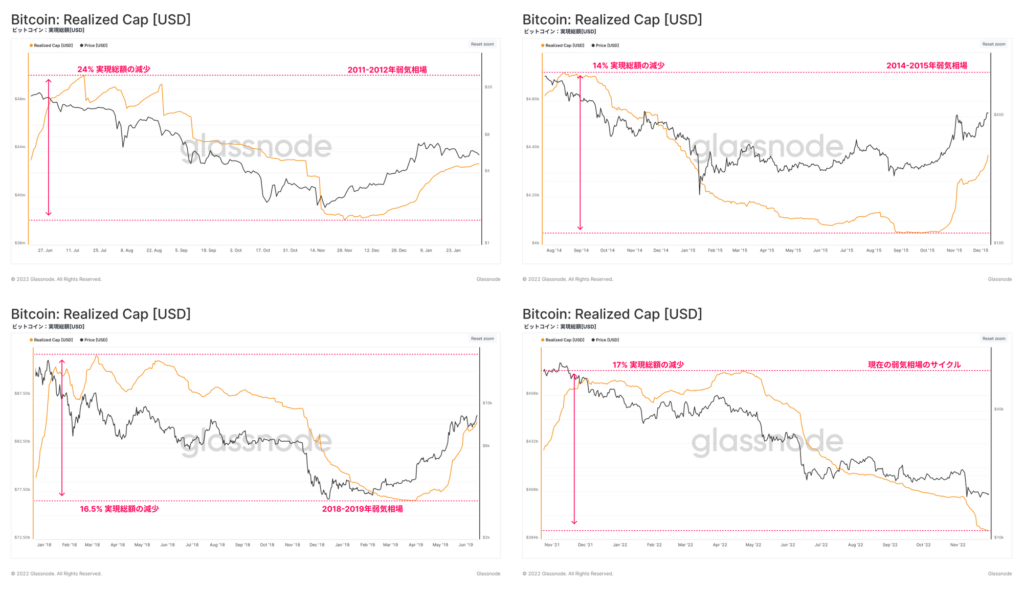 実現総額のピークからボトムまでの期間において相対的な資本流出を計測することで、過去の主要な弱気相場と現在のサイクルを比較する。