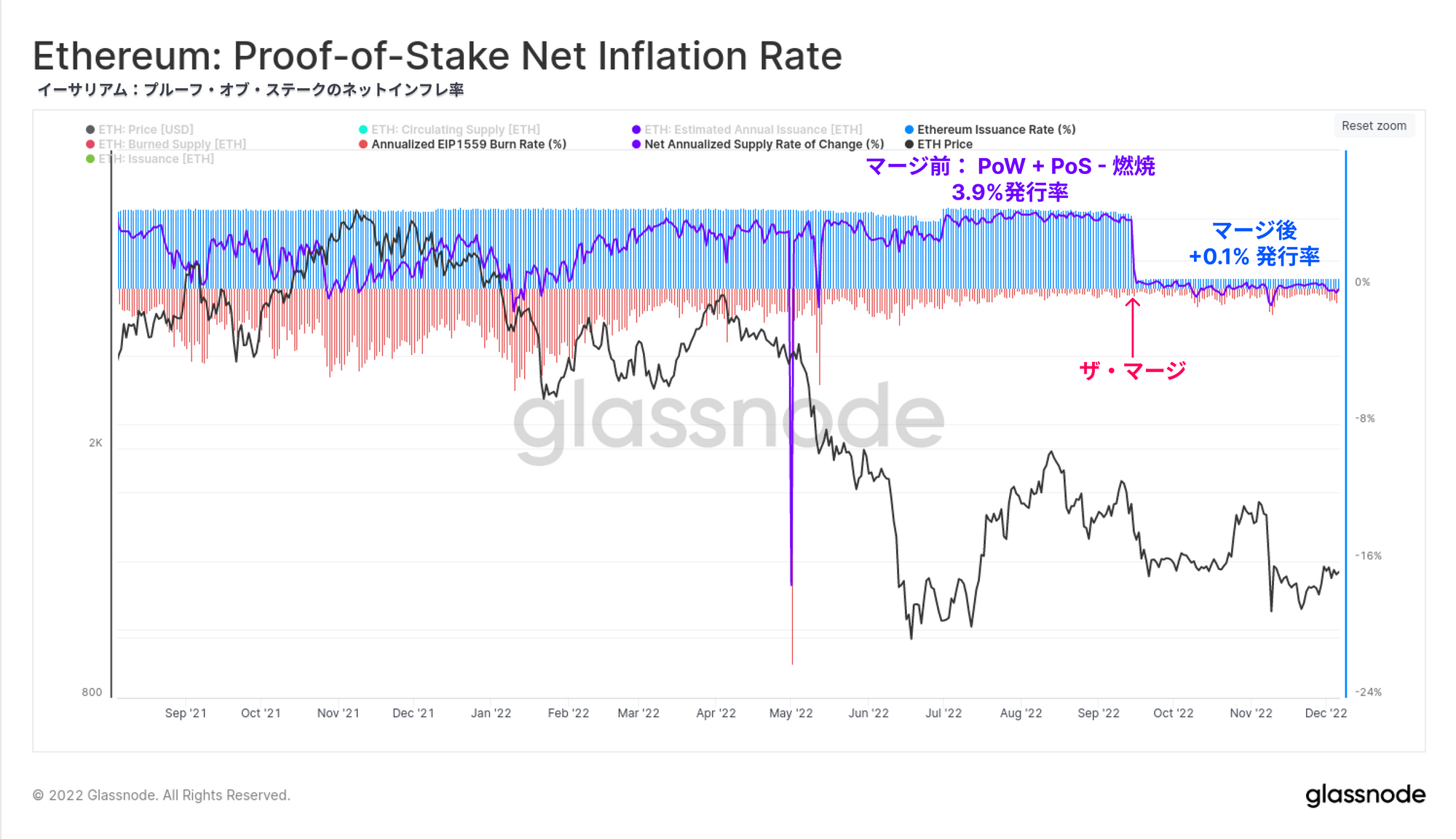 プルーフ・オブ・ステークへの移行に伴い、イーサリアムの通貨政策は大幅に低い発行スケジュールへと調整された。名目上の発行率(青)は約+0.5%だが、EIP1559の燃焼メカニズム(赤)を考慮すると、通常の日ではほぼ相殺されて約+0.1%となる。マージ前の正味のインフレ率が+3.9%であったことと比較すると、いかに発行量が劇的に変化したかが分かる。