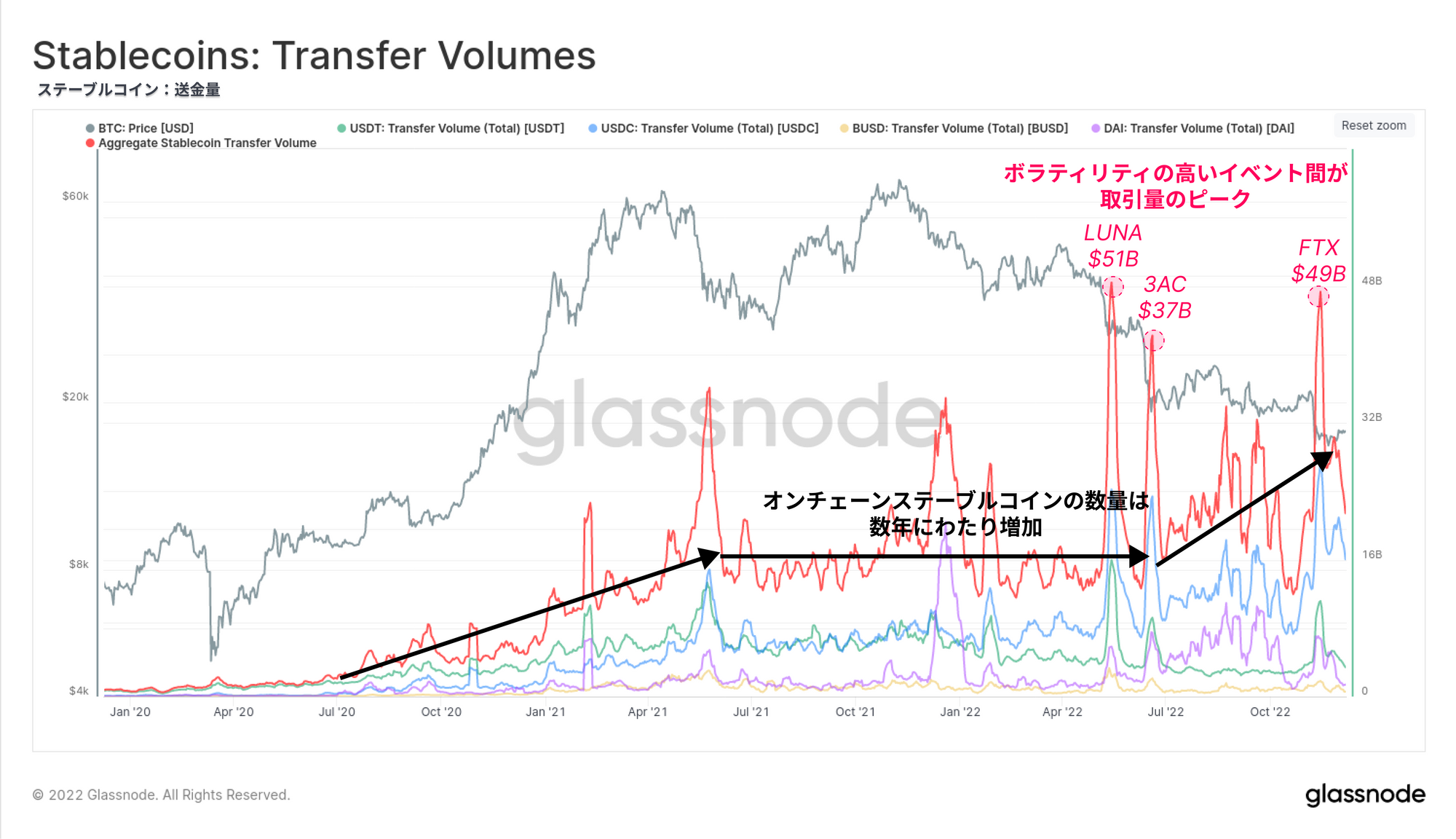 5月、6月、11月のボラティリティの高い売り相場の際、ステーブルコインの総送金量は370億ドルから510億ドルの間でピークに達しており、デレバレッジイベント時の米ドル流動性に対する極端な需要を示唆している。