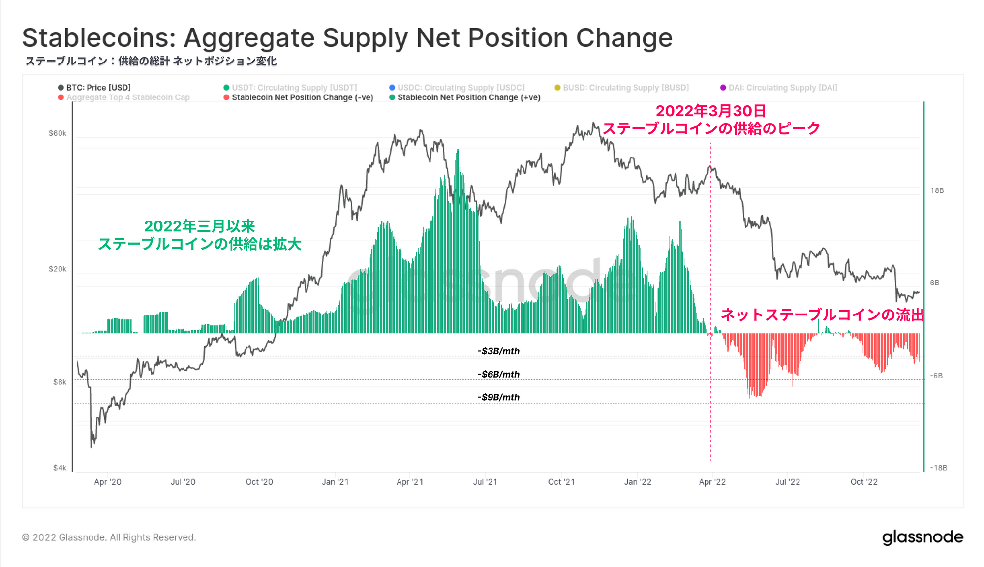 ステーブルコインは2020年以降、業界の基幹的資産となり、現在は時価総額上位6資産のうち3資産がステーブルコインとなっている。ステーブルコインの総供給量は2022年3月に1,615億ドルでピークに達したが、その後143億ドルを超える大規模な償還があった。
