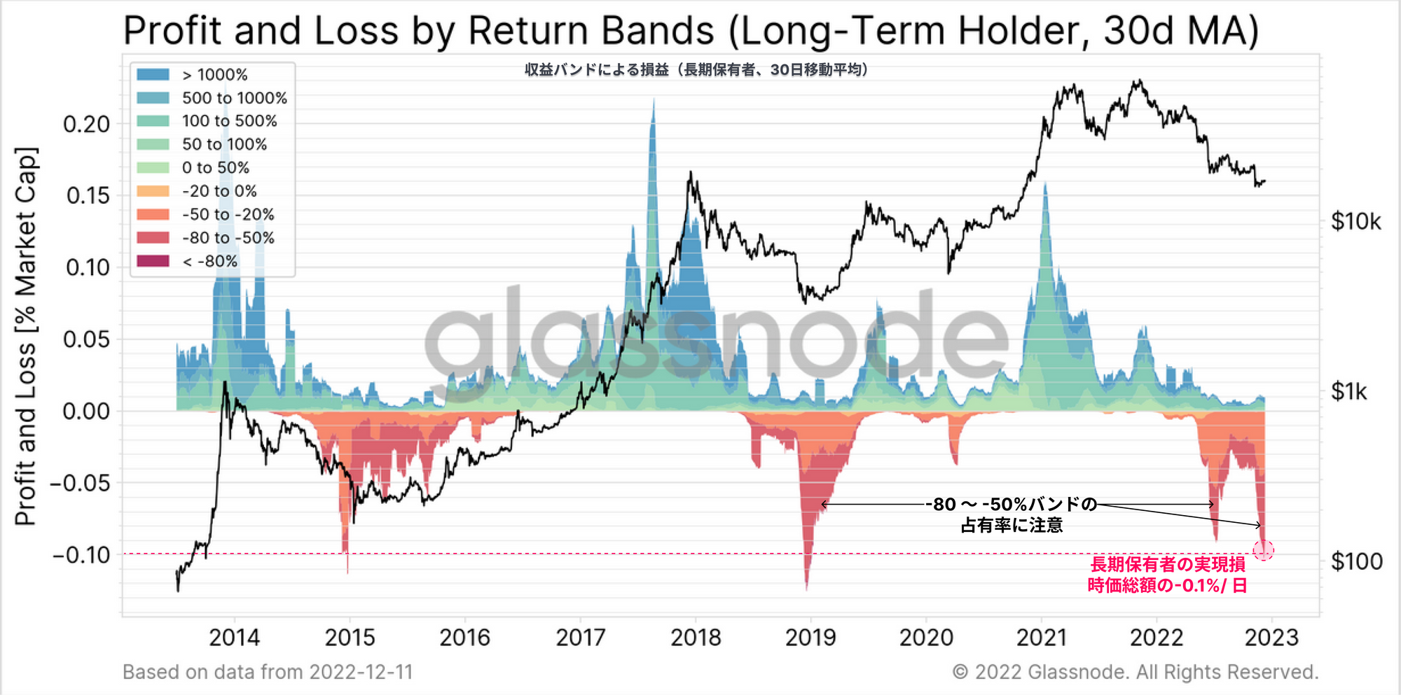注目すべきは長期保有者の影響であり、彼らはこのサイクルにおいて史上最大の相対損失の急増を2回実現した。11月における長期保有者の損失は1日あたり時価総額の-0.10%でピークに達し、その規模は2015年と2018年のサイクルにおける安値時に匹敵するレベルに相当する。6月の売り相場は1日あたり時価総額の-0.09%と同様に著しく、占有率が高い長期保有者は-50%から-80%の損失を抱えたままとなった。