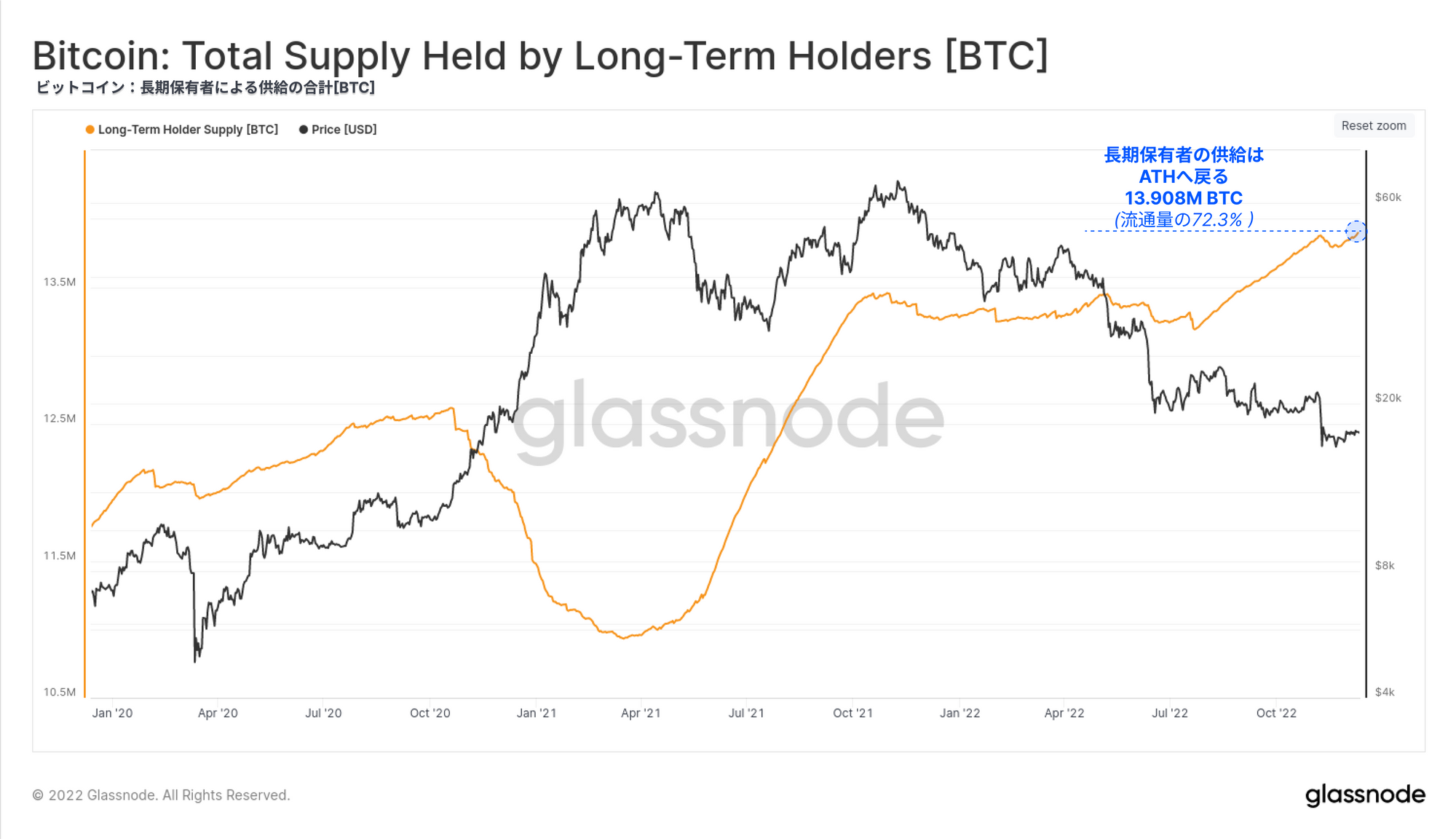 このように目を見張るような著しい損失にもかかわらず、コイン供給の年齢と、残っている人々によるHODLingの傾向は上昇し続けている。長期保有者による供給は、FTX騒動後のパニック売りから完全に戻し、1,390万8,000BTC(流通供給の72.3%)という新たなATHに達した。