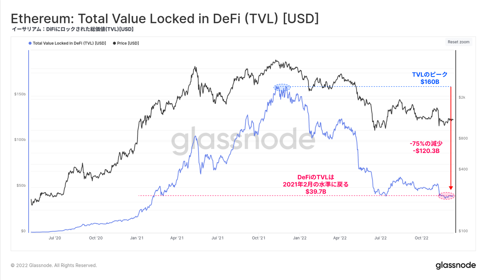 トークン価格が極端に下落し流動性が著しく低下したため、DeFiにロックされた総額は劇的に減少した。2021年11月で市場のATHである1600億ドルのピークを迎えた後、DeFiでロックされた総価値は1203億ドル以上(-75%)減少している。これによりDeFiの担保価値は3970億ドルまで下がり、2021年2月の水準に戻った。