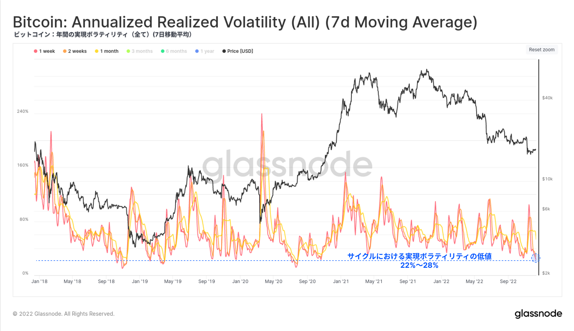 混沌を極めた1年を経て12月に入り、ビットコイン市場は非常に静かになってきた。BTCの短期実現ボラティリティは現在、22%(1週間)、28%(2週間)と数年来の低水準にあり、2020年10月以来の低ボラティリティなレジームとなっている。