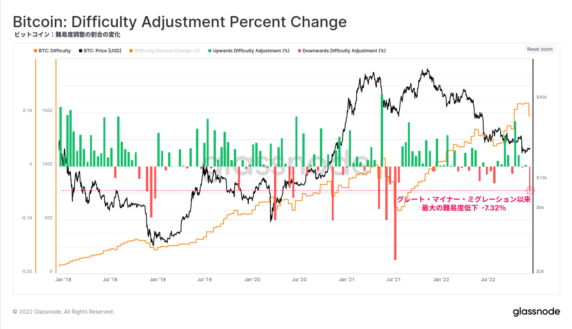先週は、2021年7月のグレート・マイニング・マイグレーション以来、最大の難易度の下方調整が行われた。難易度は7.32%低下し、アクティブなハッシュレートの大部分がスイッチオフしたことを意味しており、おそらく継続的な収入ストレスを受けた結果と考えられる。