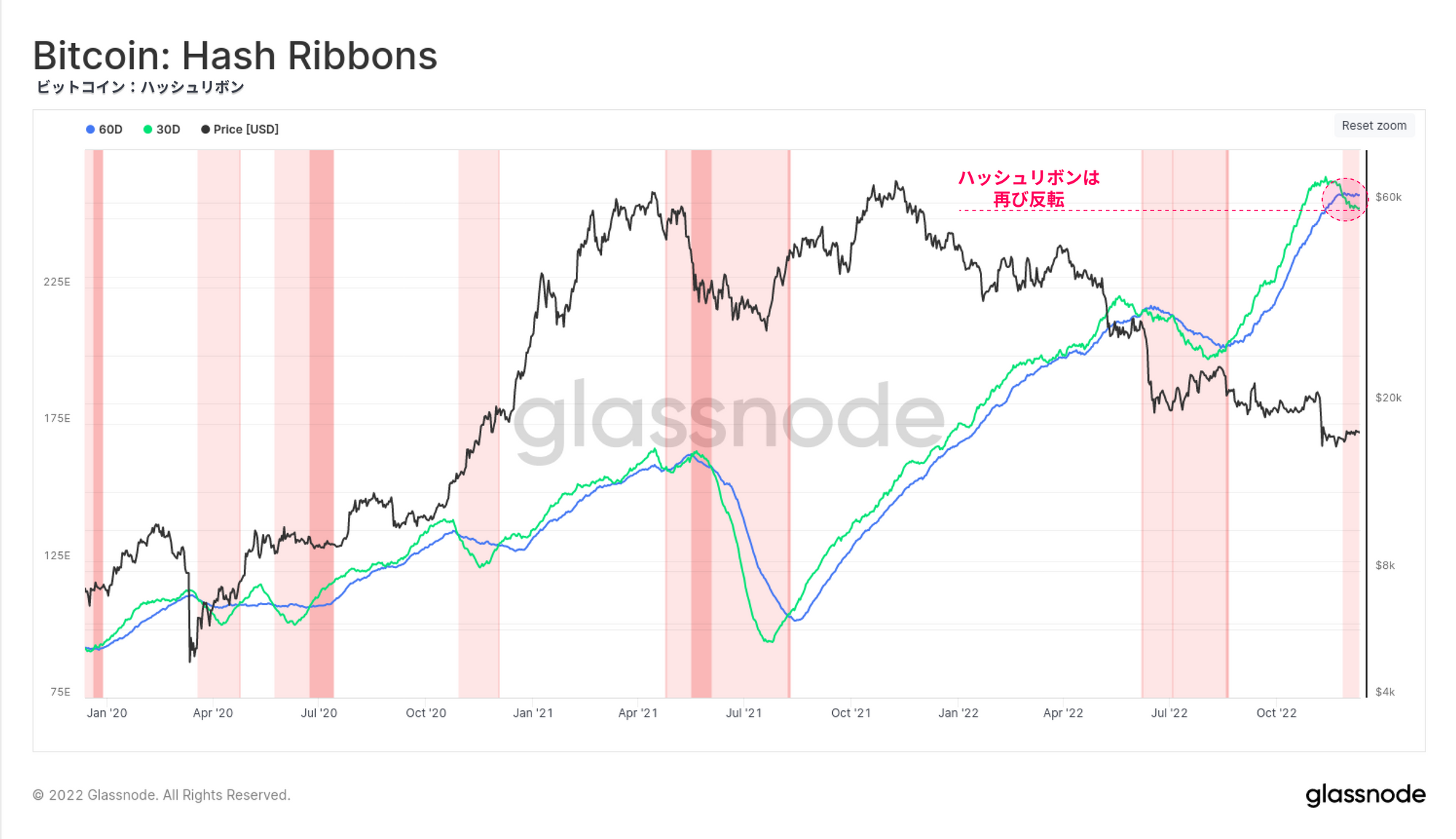 その結果、ハッシュリボンも再び反転し、11月下旬にクロスオーバーが発生した。一部のオペレーターがASICリグをオフラインにするほど、マイニング業界にストレスがあることを意味している。これは通常、マイナーの収入源がOPEX費用を下回り、リグの採算が合わなくなることに関連している。
